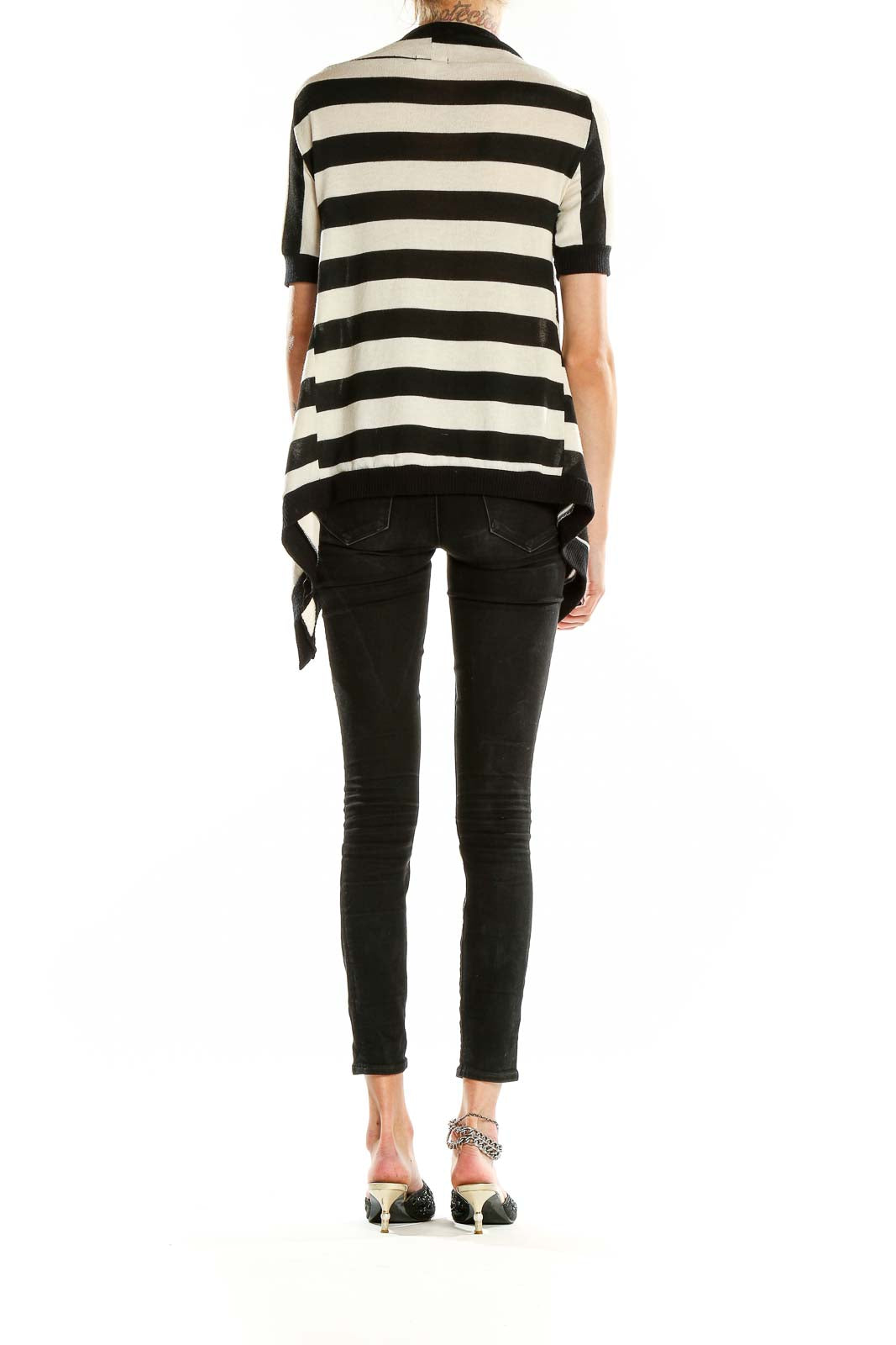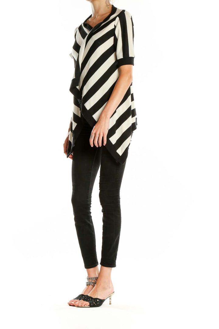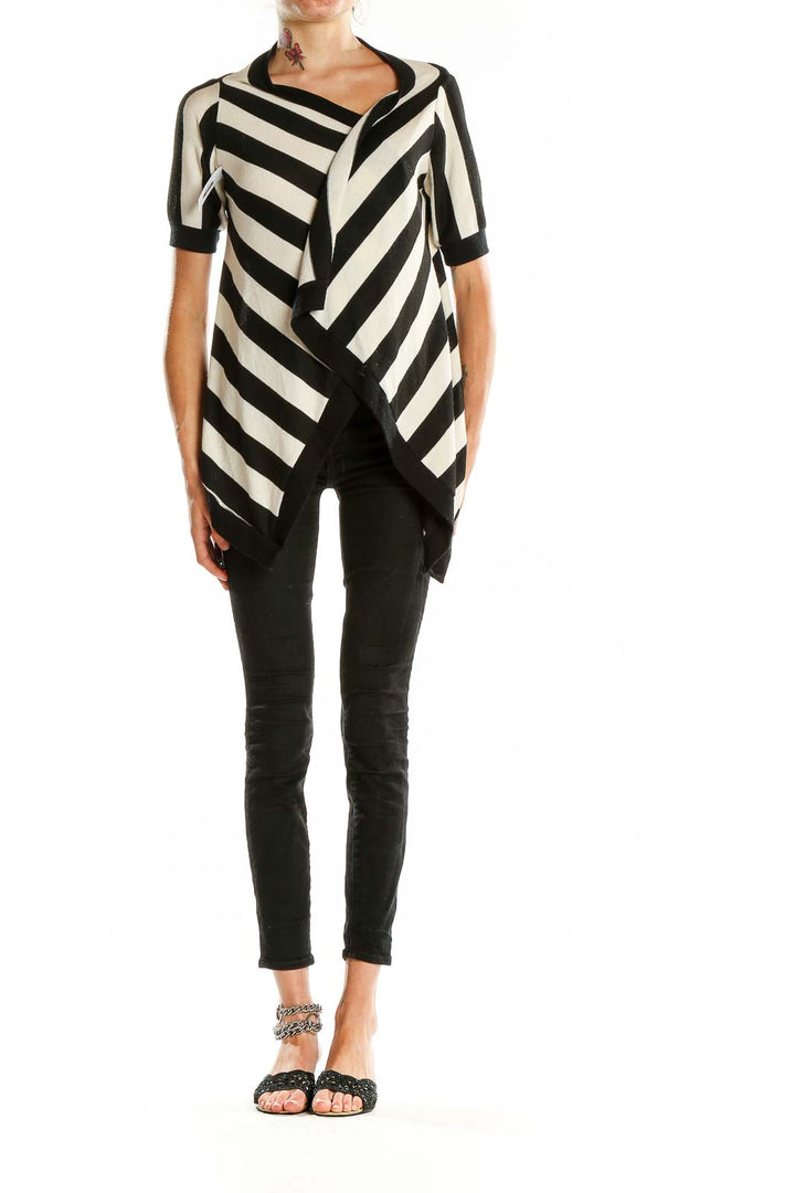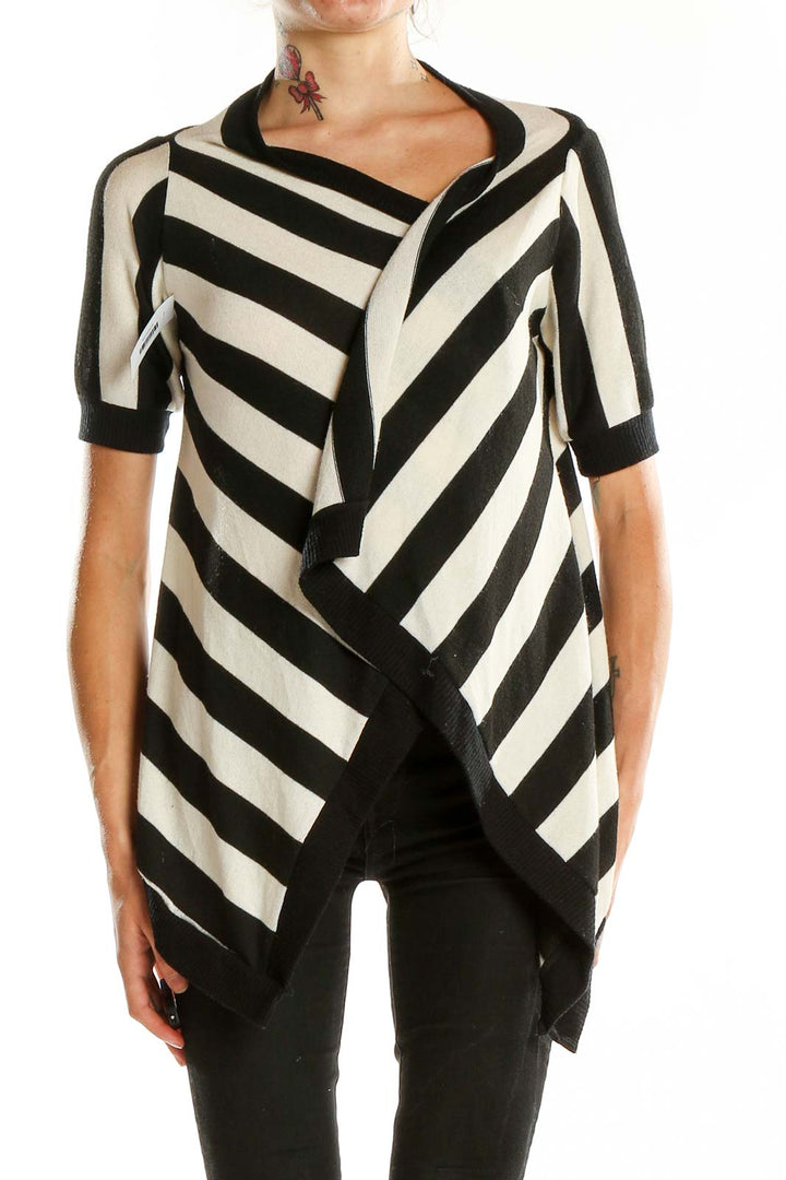 Make a bold statement with this eye-catching Black and White Striped Asymmetrical Knit Top from Silence + Noise. This unique piece features a striking diagonal stripe pattern that creates a visually interesting and slimming effect. The asymmetrical design adds a modern, edgy twist to the classic striped look, perfect for those who love to stand out from the crowd.