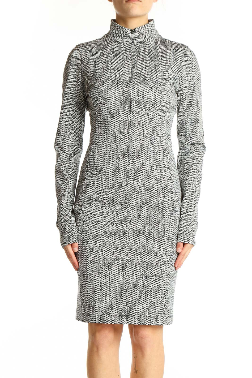 Elevate your athletic-inspired style with this sleek gray herringbone bodycon dress from Athleta. Crafted from a performance-ready blend of nylon, polyester, and spandex, this form-fitting dress offers both comfort and flexibility for all-day wear. The high mock neck and long sleeves provide coverage and warmth, while the knee-length cut creates a flattering silhouette. The subtle herringbone pattern adds a touch of sophistication to this versatile piece, making it perfect for transitioning from workout to casual outings. In excellent condition, this size small dress features precise measurements to ensure a perfect fit. Whether you're heading to yoga class or meeting friends for brunch, this Athleta dress is the ideal choice for the active woman who values both style and functionality.