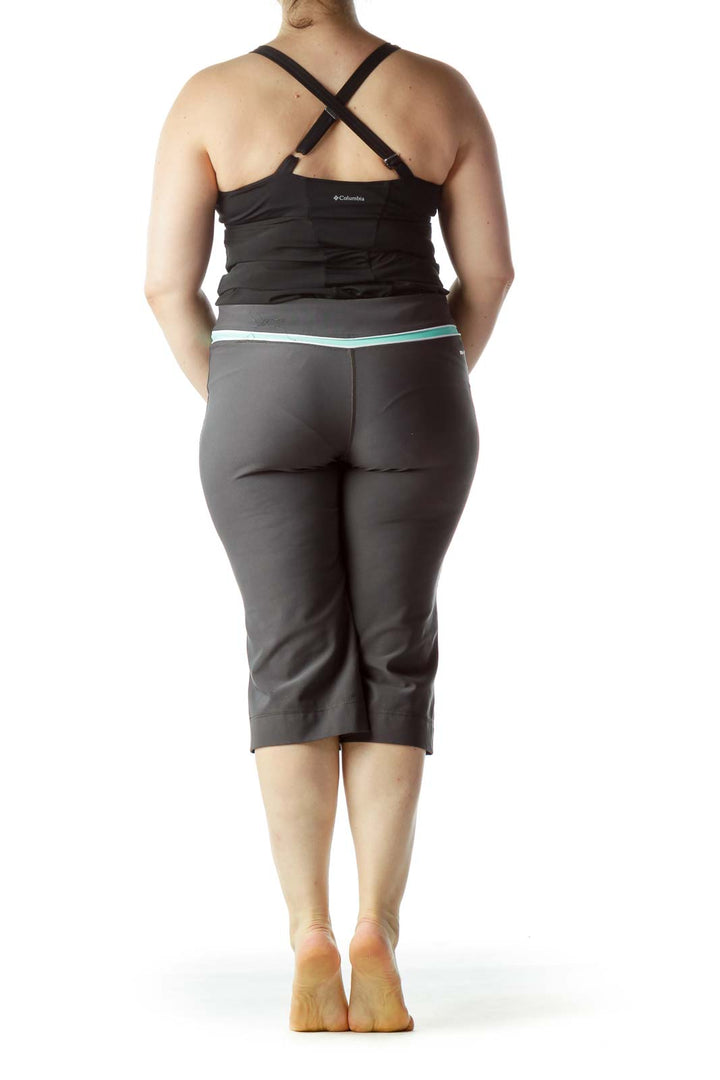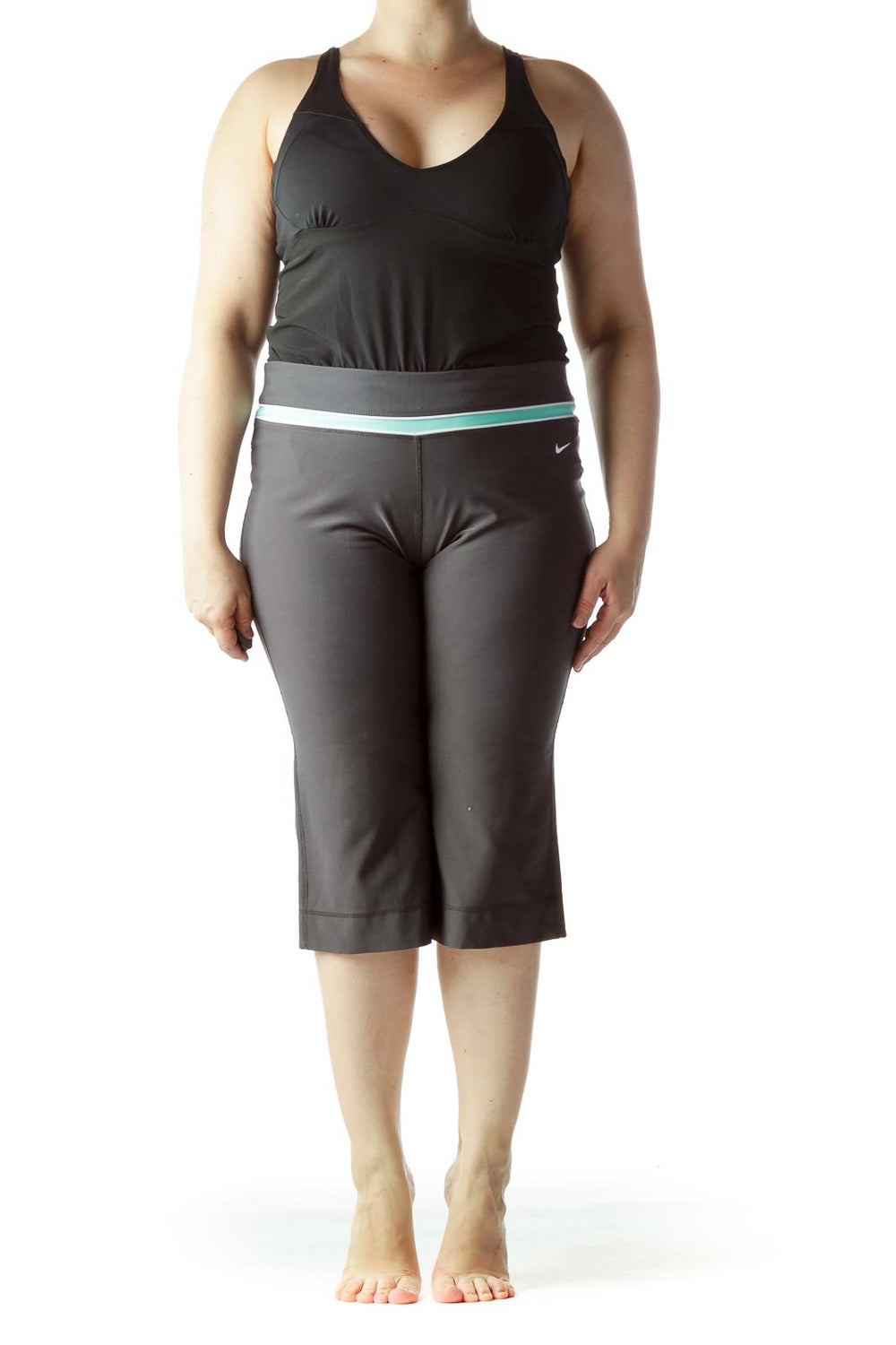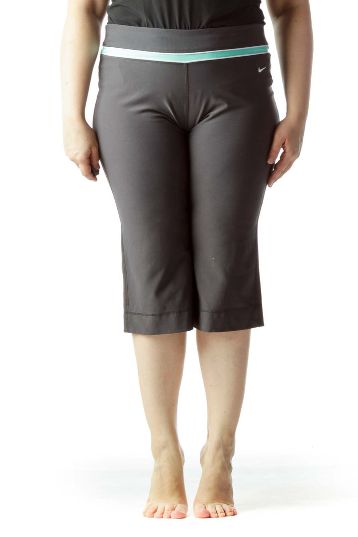 Front view of gray Nike capri yoga pants with mint waistband trim