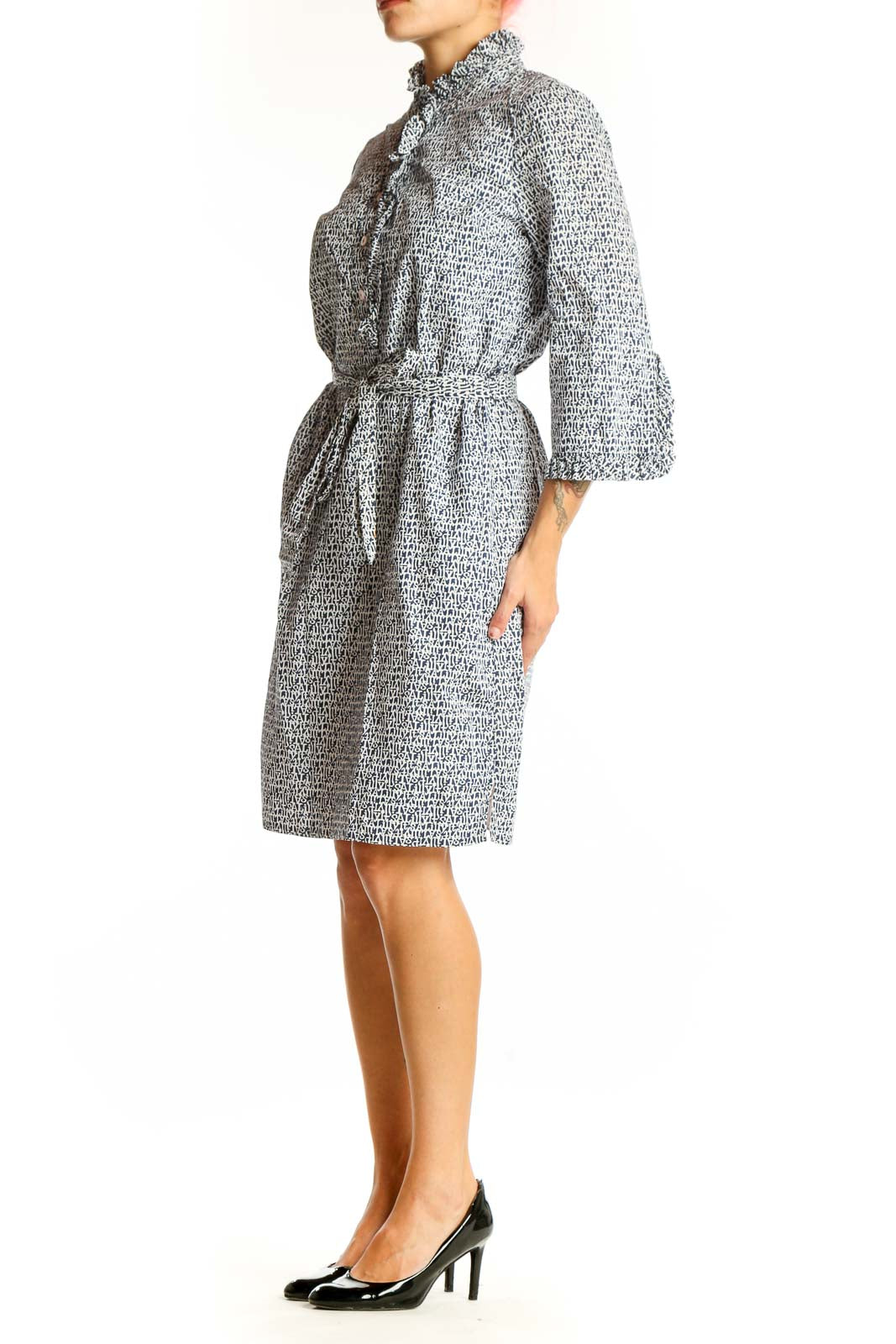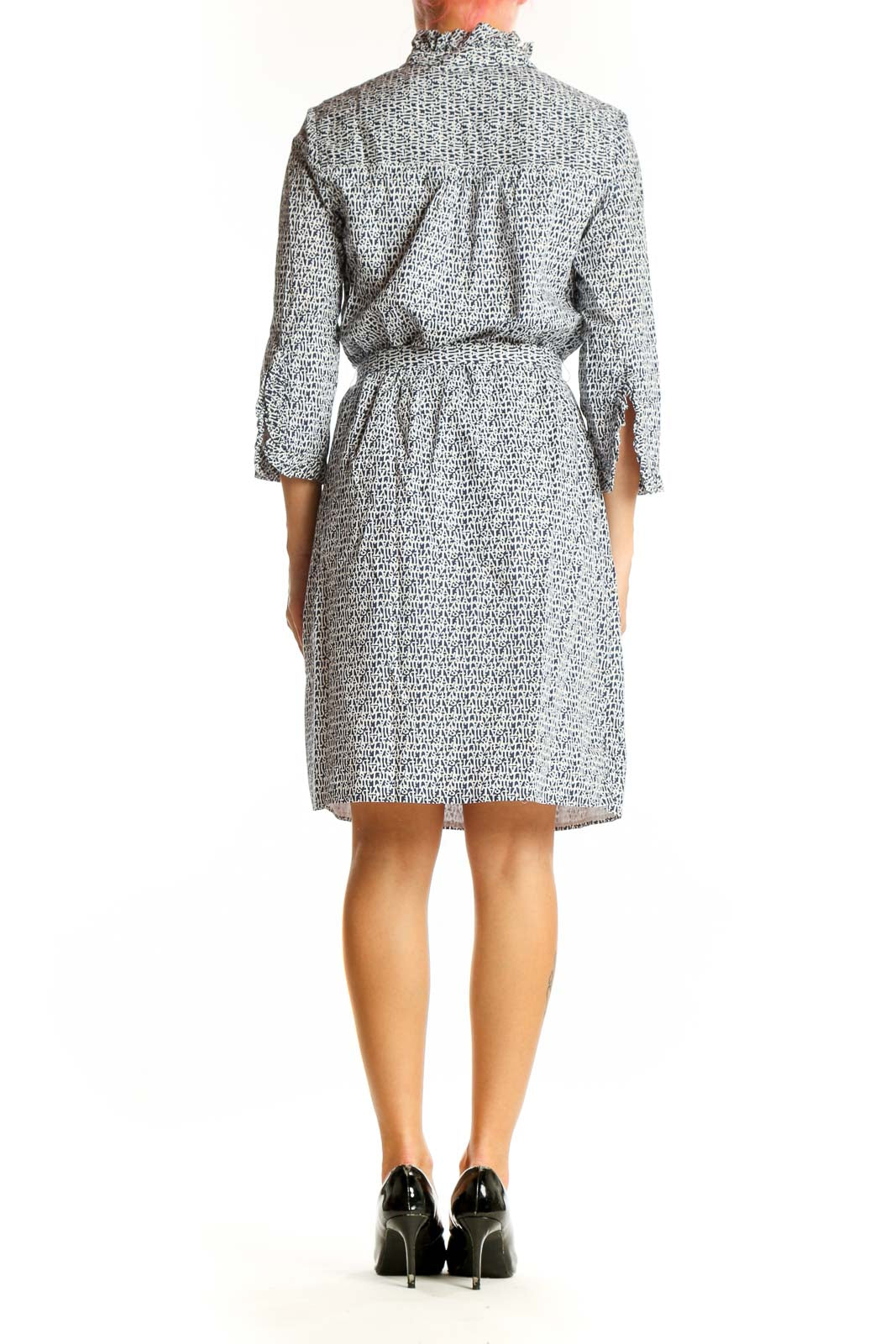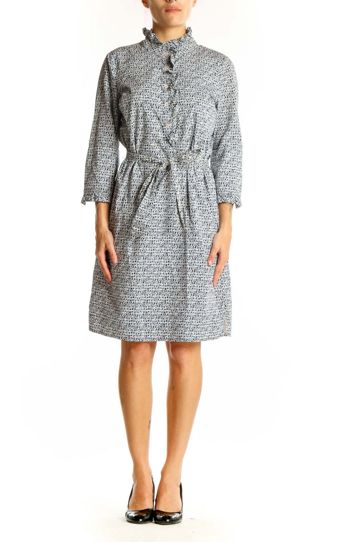 The standout feature of this dress is its intricate pattern, showcasing a delightful mix of abstract shapes and lines in shades of gray and white. The high collar with ruffle detailing adds a feminine touch, while the button-down front allows for easy wear and versatility. Three-quarter length sleeves provide comfort and style for various seasons.
