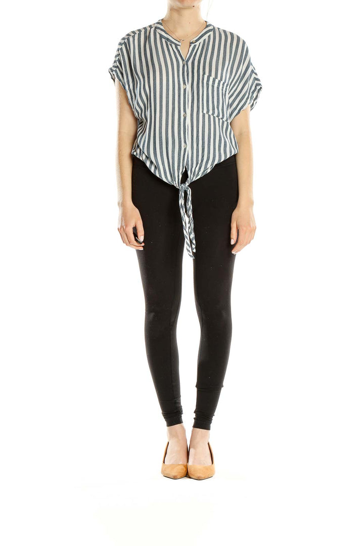 Front view of Lulu's Blue and White Striped Tie-Front Blouse