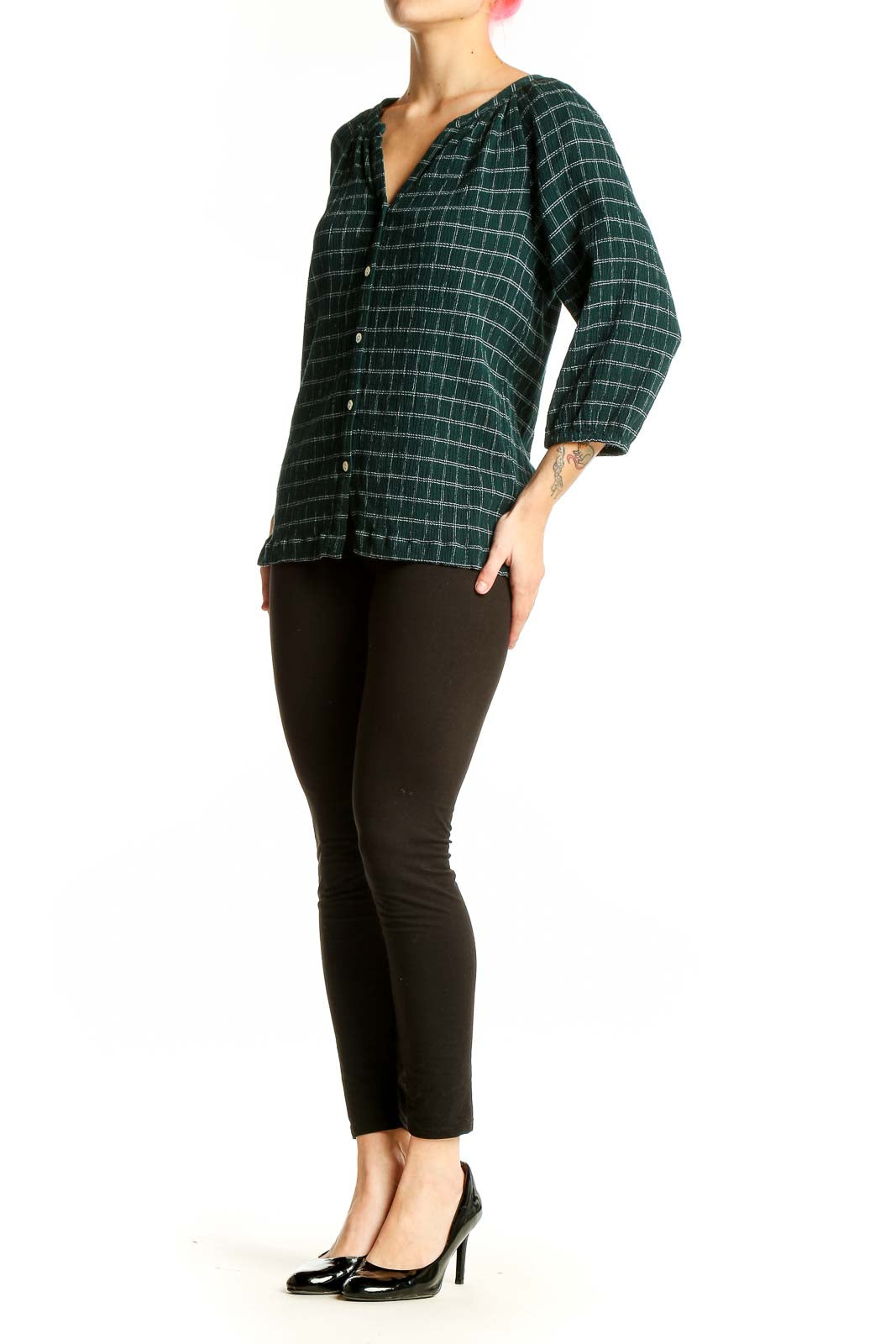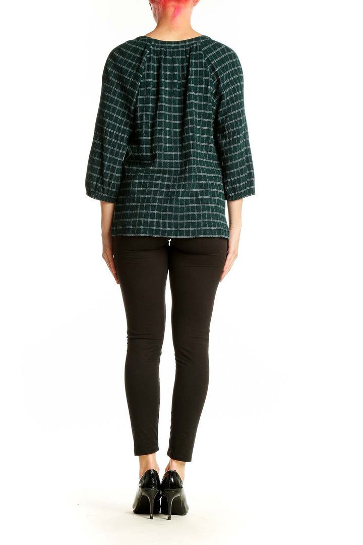 Elevate your casual wardrobe with this charming green plaid top from J.Jill. Crafted from a soft and breathable blend of cotton and rayon, this button-up shirt offers both comfort and style. The relaxed fit and three-quarter length sleeves make it perfect for year-round wear. The gathered neckline adds a feminine touch, while the classic plaid pattern in shades of forest green and white creates a timeless look. In excellent condition, this versatile piece can be easily dressed up or down for various occasions. The measurements ensure a flattering fit for size XS, with a 36" bust, 34" waist, and 24" length. Add this J.Jill top to your collection for an effortlessly chic and comfortable addition to your everyday outfits.