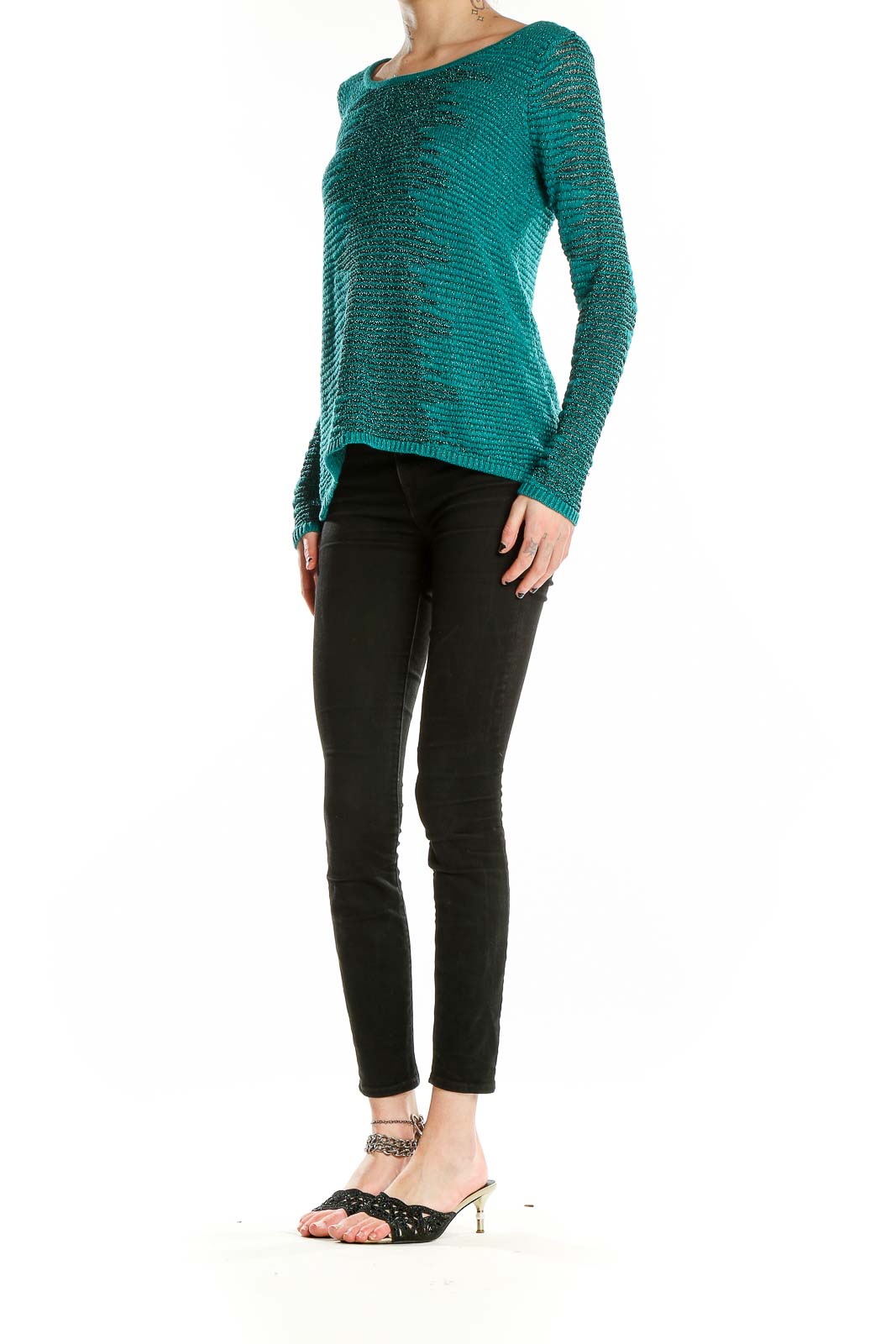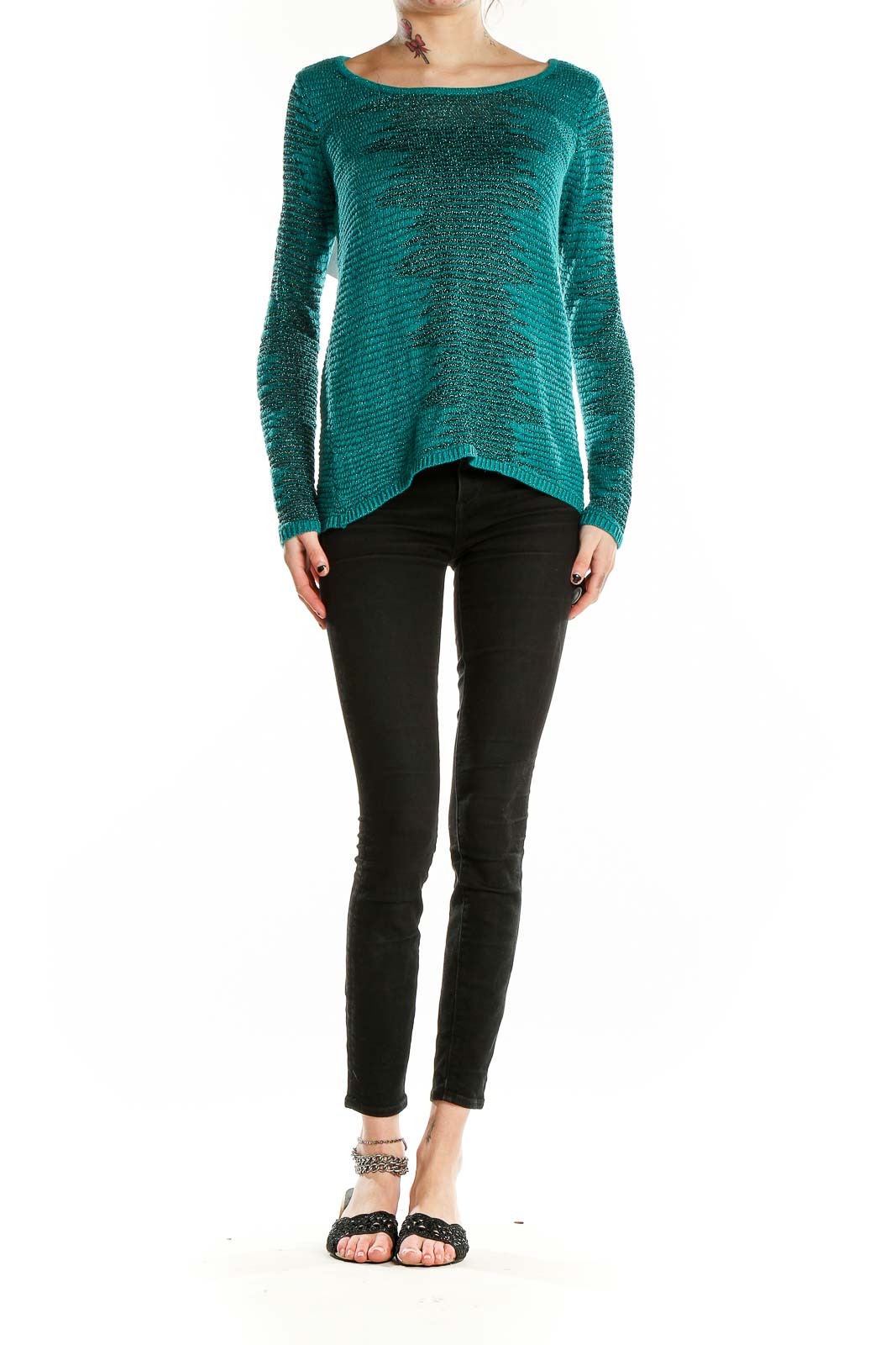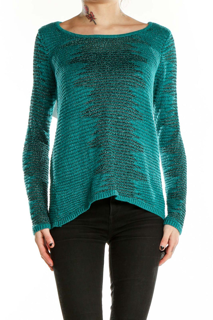 Elevate your casual wardrobe with this stunning teal metallic knit sweater from Rock & Republic. This eye-catching piece features a unique textured pattern that adds depth and visual interest to your look. The boat neckline and relaxed fit create a flattering silhouette suitable for various body types. Crafted from a luxurious blend of cotton, metallic fibers, polyester, and rayon, this sweater offers both comfort and style. The metallic threads woven throughout add a subtle shimmer, perfect for day-to-night transitions. With its excellent condition and versatile design, this sweater is a must-have addition to your closet. The medium size and provided measurements ensure a comfortable fit for most. Whether paired with jeans for a casual outing or dressed up with a skirt for a night out, this Rock & Republic sweater is sure to make a statement.