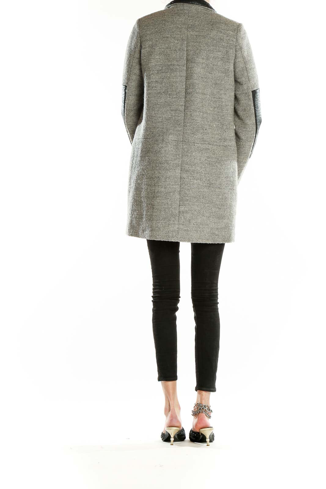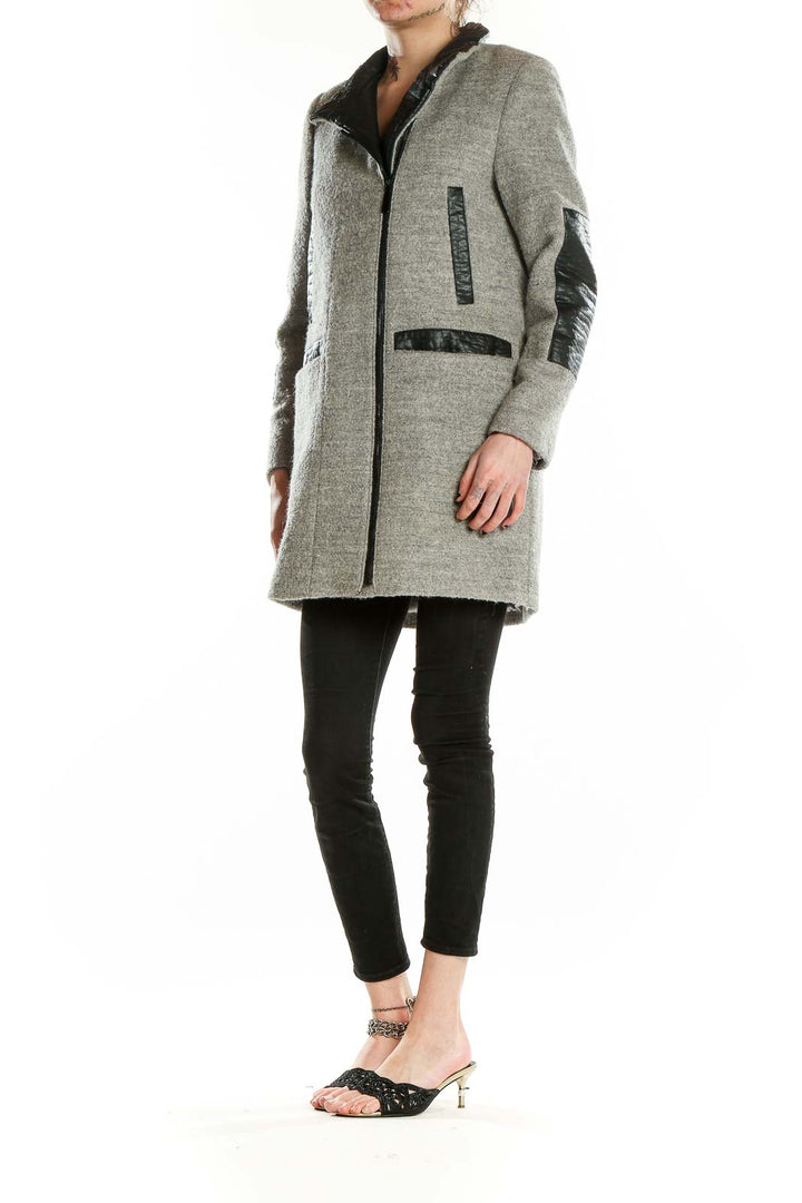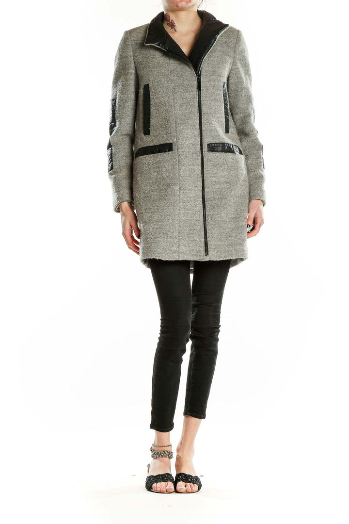 Designed with attention to detail, this coat boasts black leather-look trim accents on the collar, pockets, and sleeves, adding a touch of edgy contrast to the heather gray fabric. The asymmetrical zip closure not only provides a contemporary look but also ensures extra protection against chilly winds. Side zip pockets offer both style and functionality, perfect for keeping your hands warm or storing small essentials.