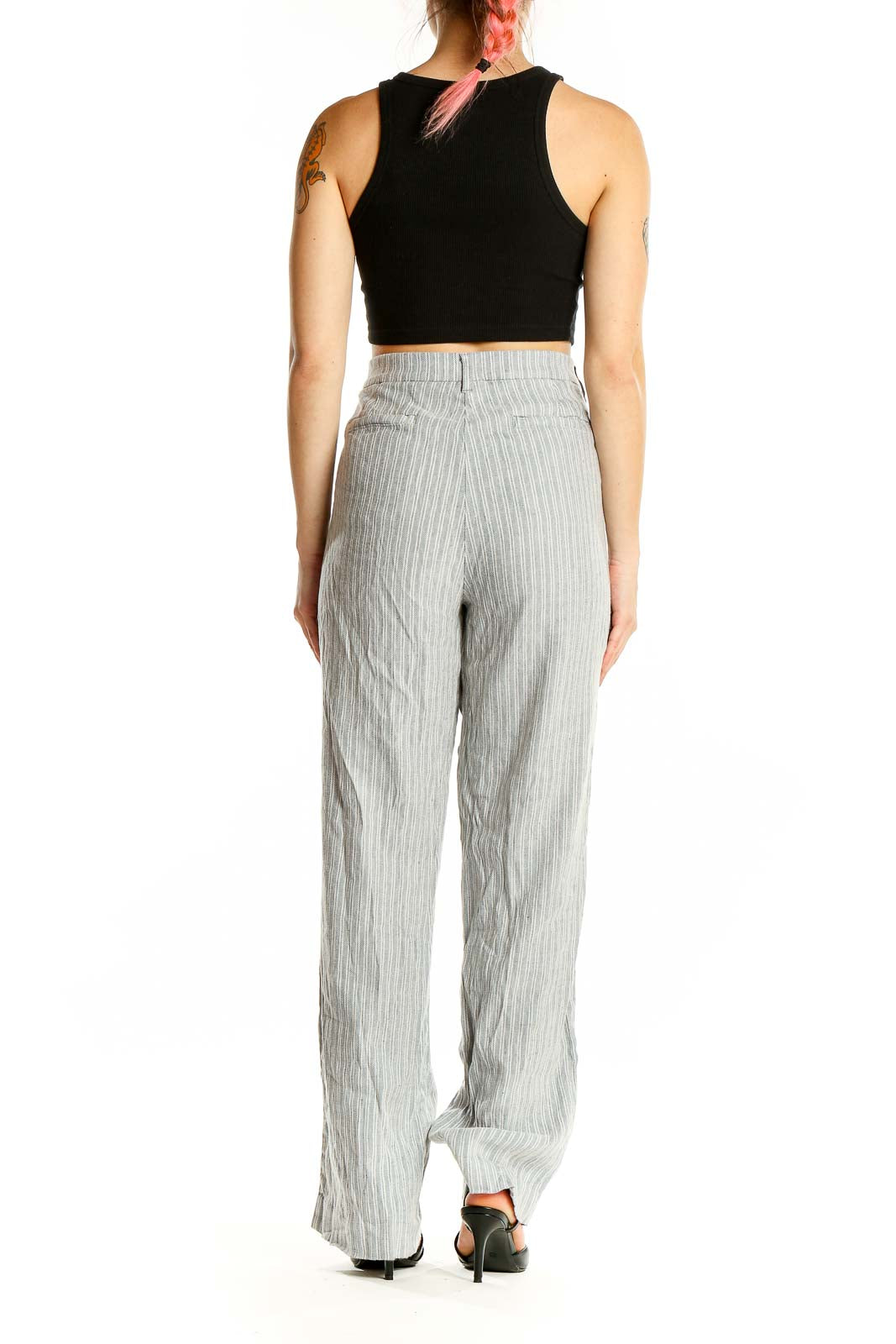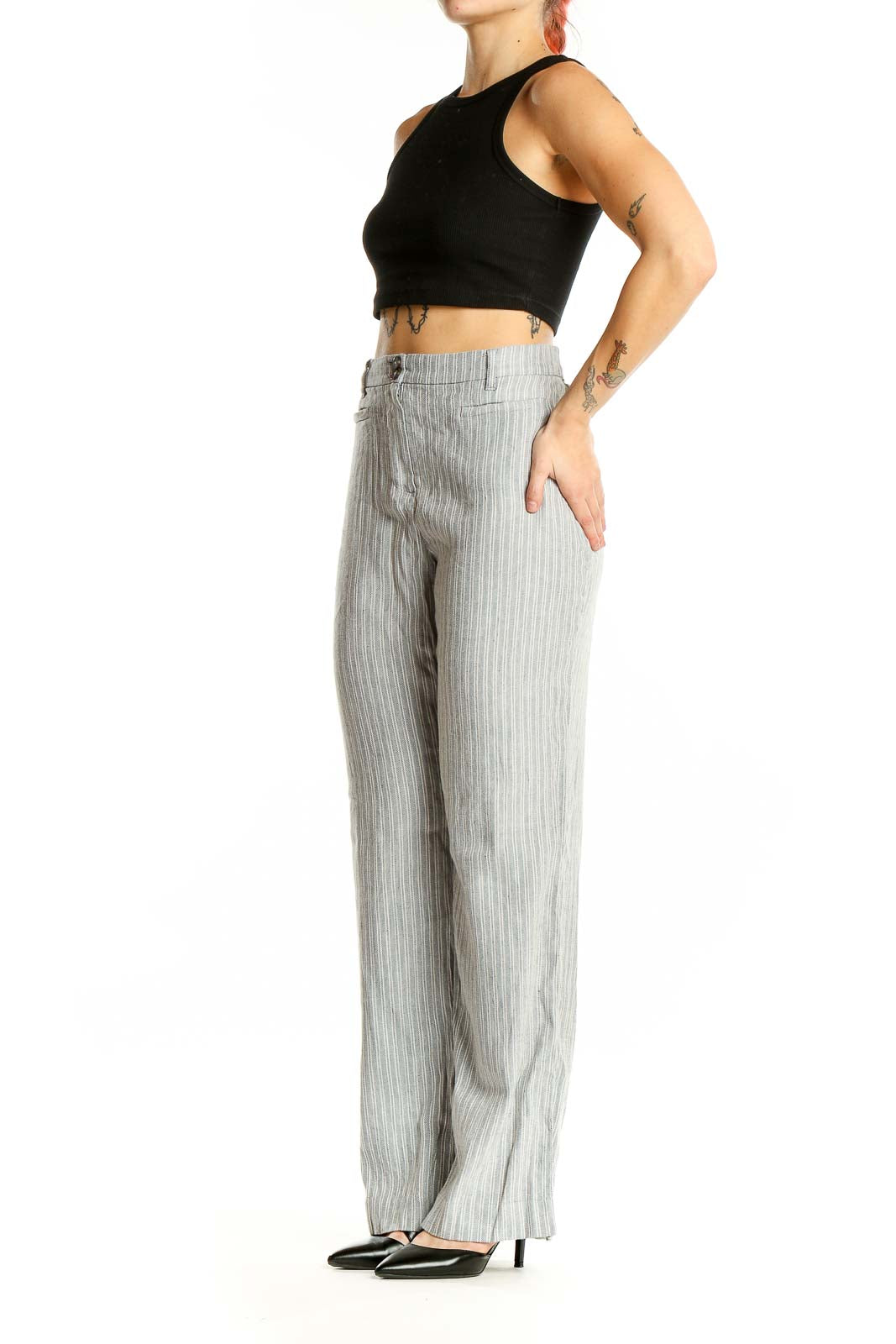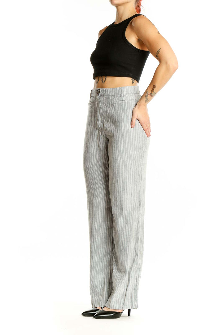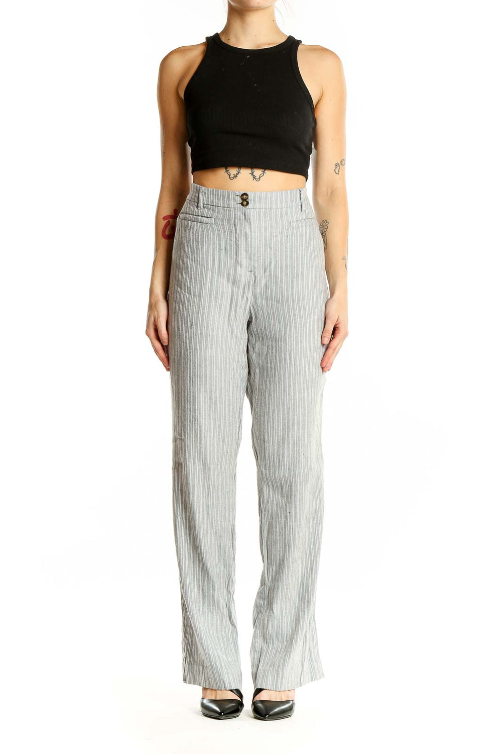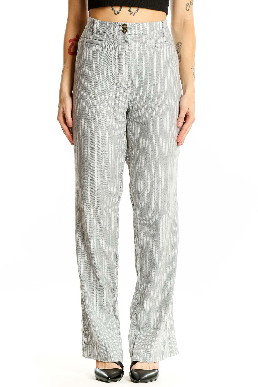 Step into effortless style with these chic gray striped wide-leg pants from J.Jill. Crafted from a luxurious blend of linen, rayon, spandex, and viscose, these pants offer both comfort and sophistication. The vertical stripes elongate your silhouette, while the high-waisted design flatters your figure. Perfect for both casual and semi-formal occasions, these pants feature a relaxed fit through the hips and legs, creating a breezy, elegant look. The lightweight fabric makes them ideal for warmer weather or as a versatile year-round staple. With a generous 61-inch length and 44-inch hip measurement, these XL-sized pants provide ample coverage and a flattering drape. The good condition ensures you'll look polished and put-together every time you wear them. Pair with a crisp white blouse for a classic office look or dress them down with a casual tee for weekend outings.