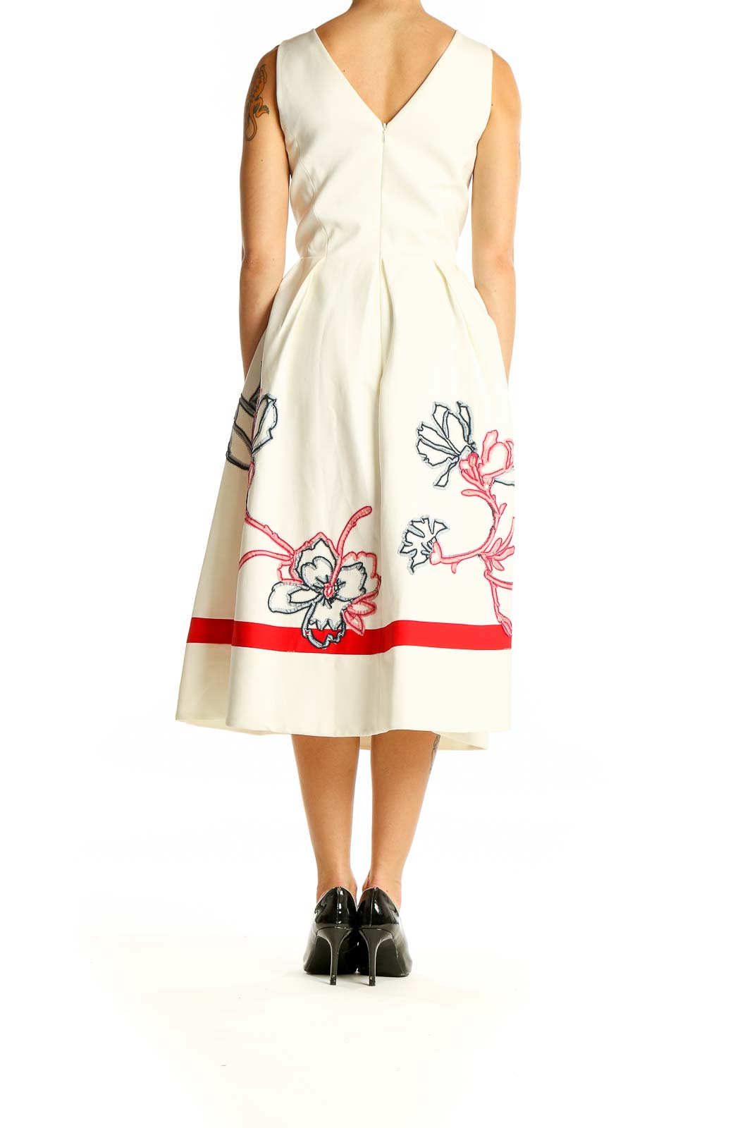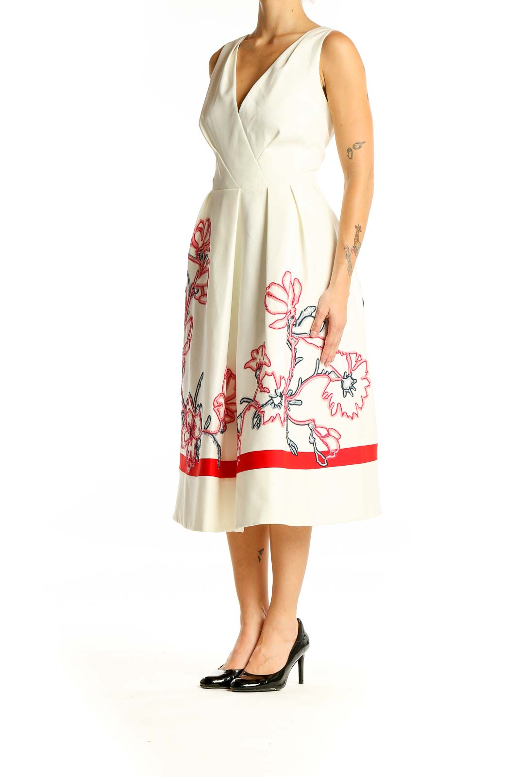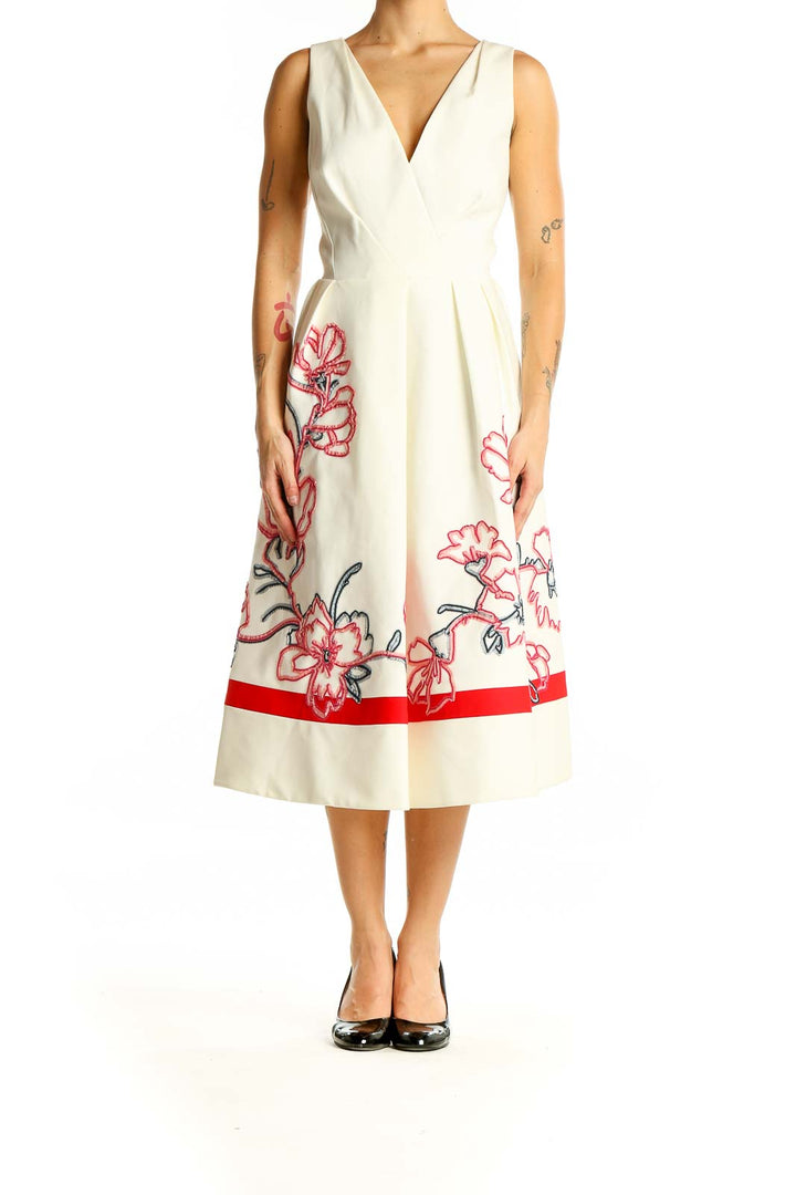 Make a statement with this elegant white midi dress from Karen Millen. The dress features a stunning floral embroidery in shades of red and green, adding a touch of romance and sophistication to your look. The V-neckline and sleeveless design create a flattering silhouette, while the pleated skirt adds movement and grace. A bold red stripe near the hem provides a striking contrast, elevating the overall design. Crafted from a comfortable blend of cotton, elastane, and polyamide, this dress ensures both style and comfort. The excellent condition of this piece guarantees you'll turn heads at your next special occasion. With its versatile design, this dress can easily transition from day to night events.