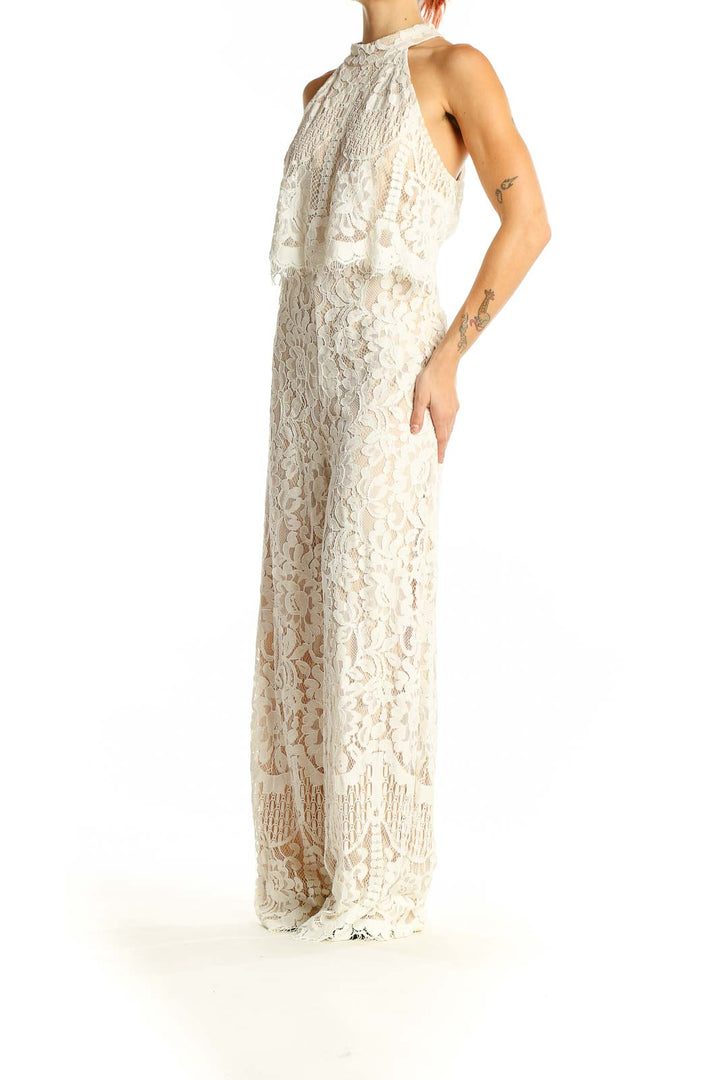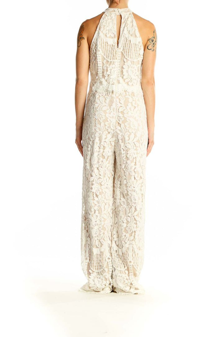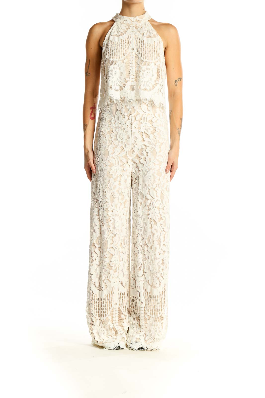 Make a stunning entrance in this exquisite ivory lace jumpsuit from Lulu's. The halter neck design adds a touch of elegance, while the all-over lace pattern exudes romance and sophistication. Featuring a fitted bodice with intricate detailing and wide-leg pants, this jumpsuit offers a flattering silhouette for various body types. The sheer lace overlay creates a captivating illusion effect, perfect for special occasions or evening events. Delicate fringe details along the neckline and hem add a playful, bohemian touch to this already enchanting piece. Crafted from a blend of cotton and polyester, it ensures both comfort and style. In excellent condition, this jumpsuit is a versatile addition to any fashion-forward wardrobe.