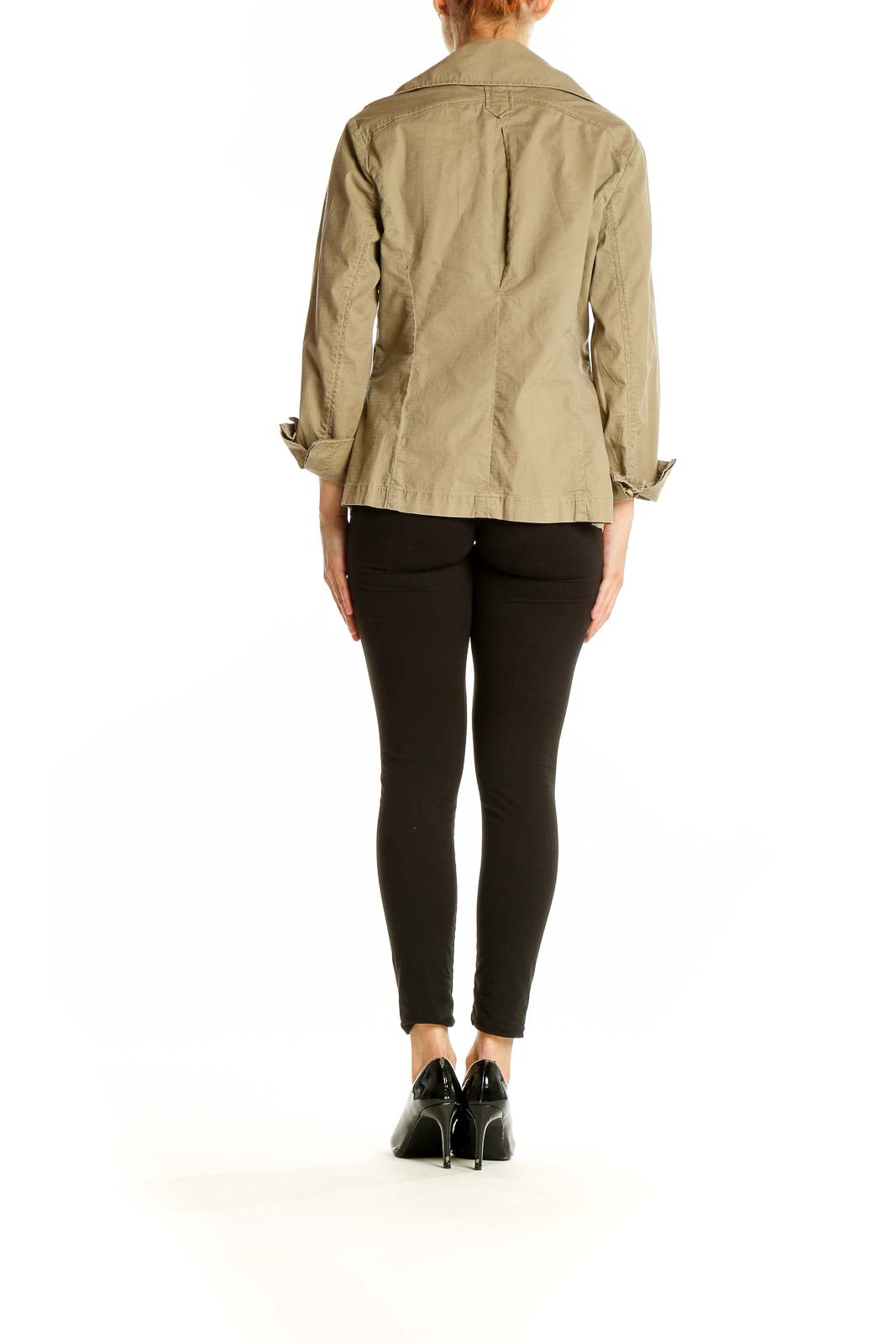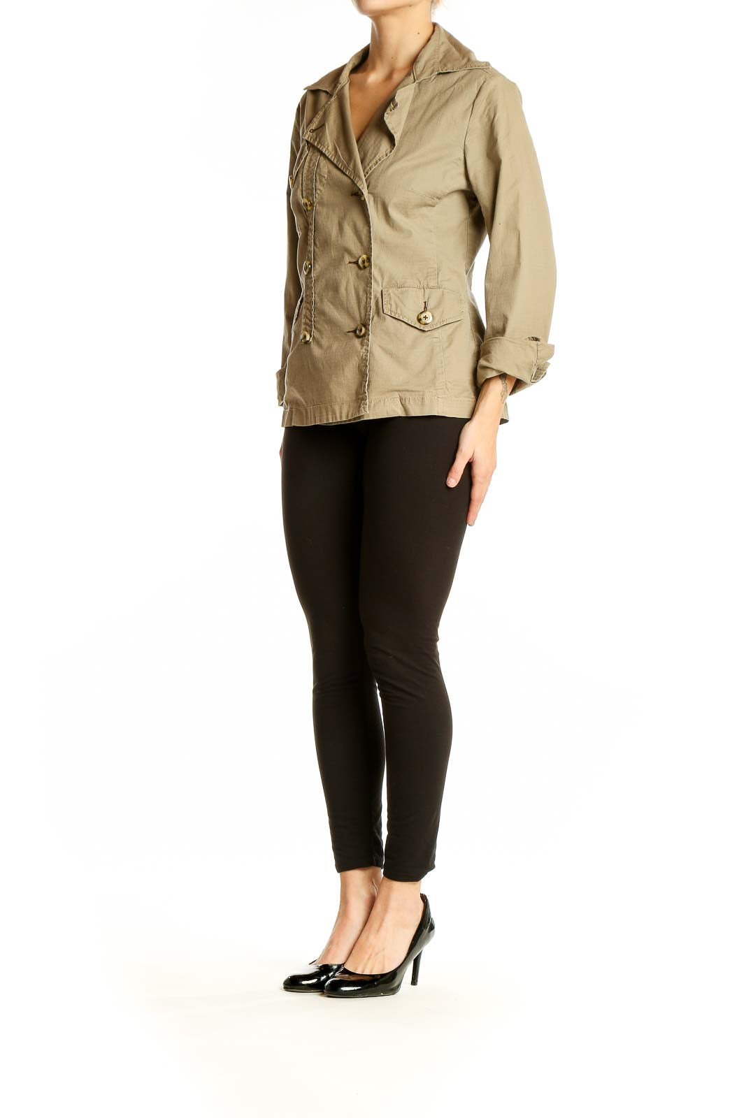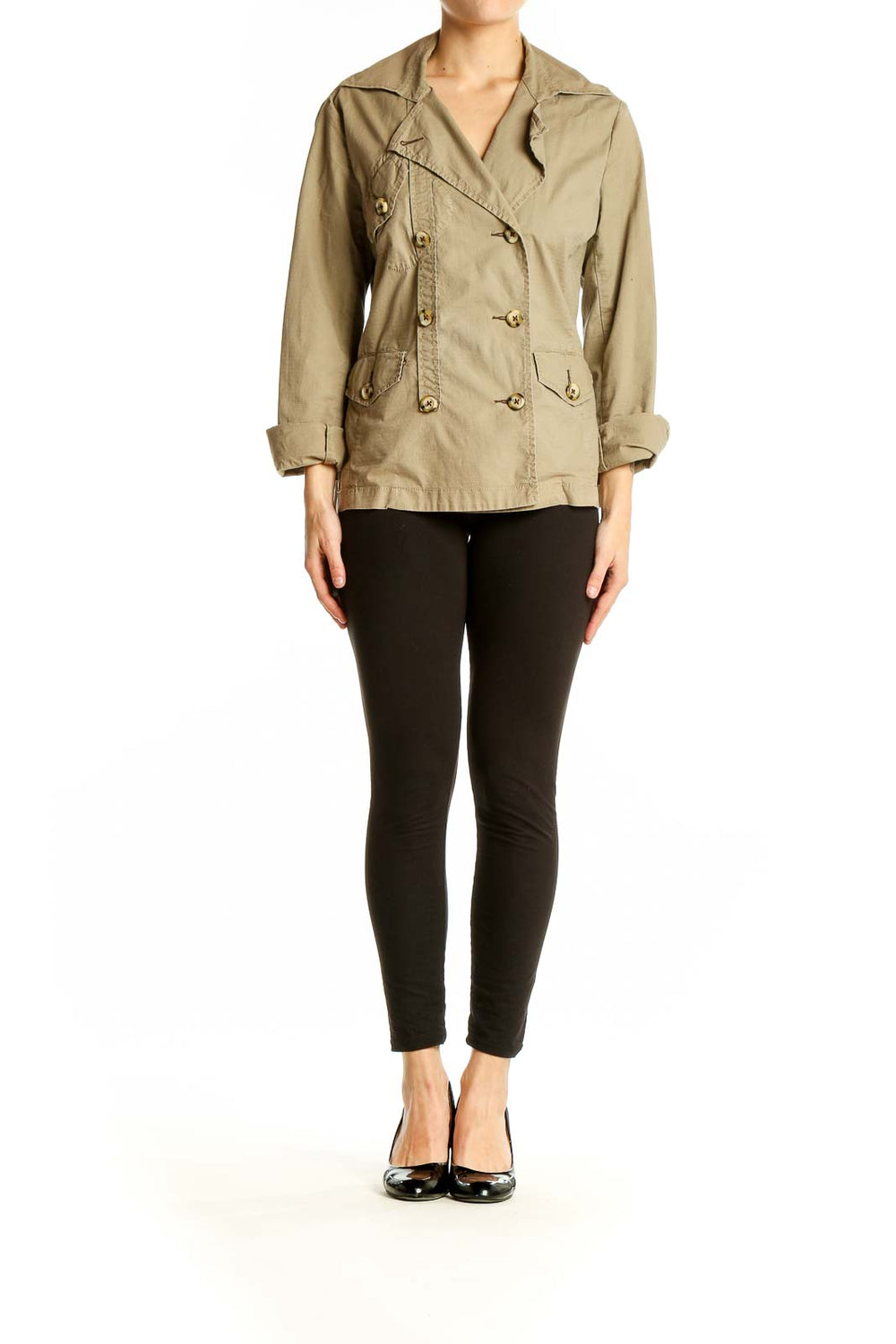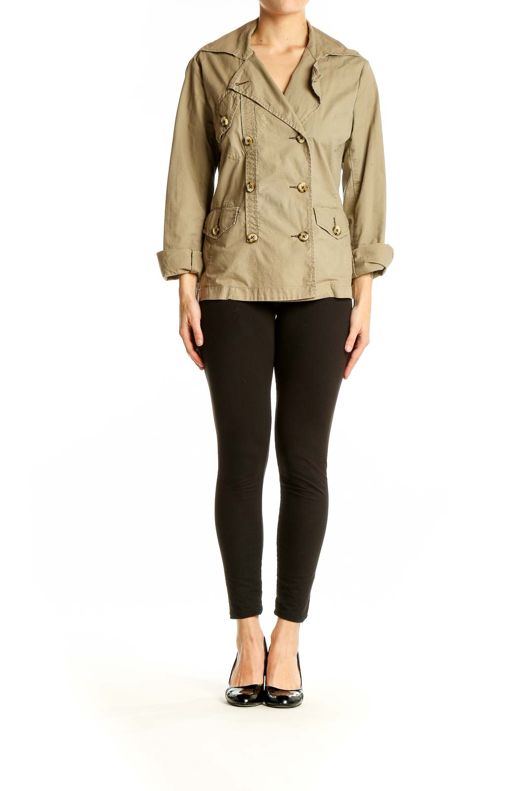 Elevate your casual wardrobe with this chic khaki double-breasted jacket from Cabi. Crafted from a comfortable cotton-spandex blend, this versatile piece offers both style and flexibility. The classic double-breasted design features eye-catching gold buttons that add a touch of sophistication to its military-inspired silhouette.