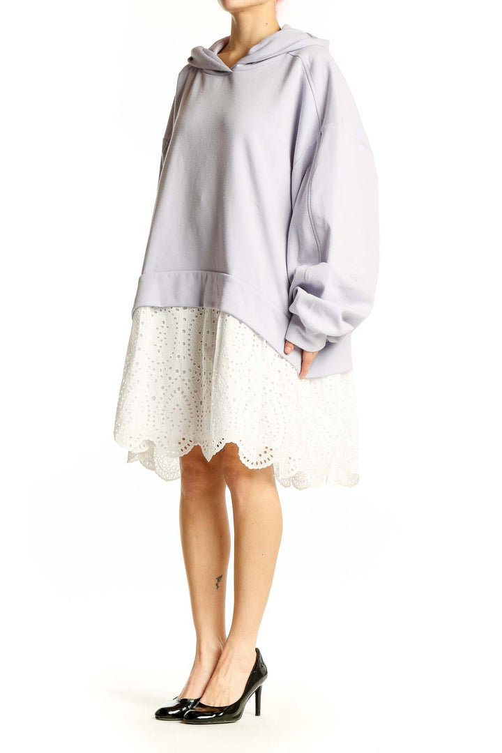 Front view of Light Gray Oversized Hoodie Dress by Pilcro with white eyelet lace skirt