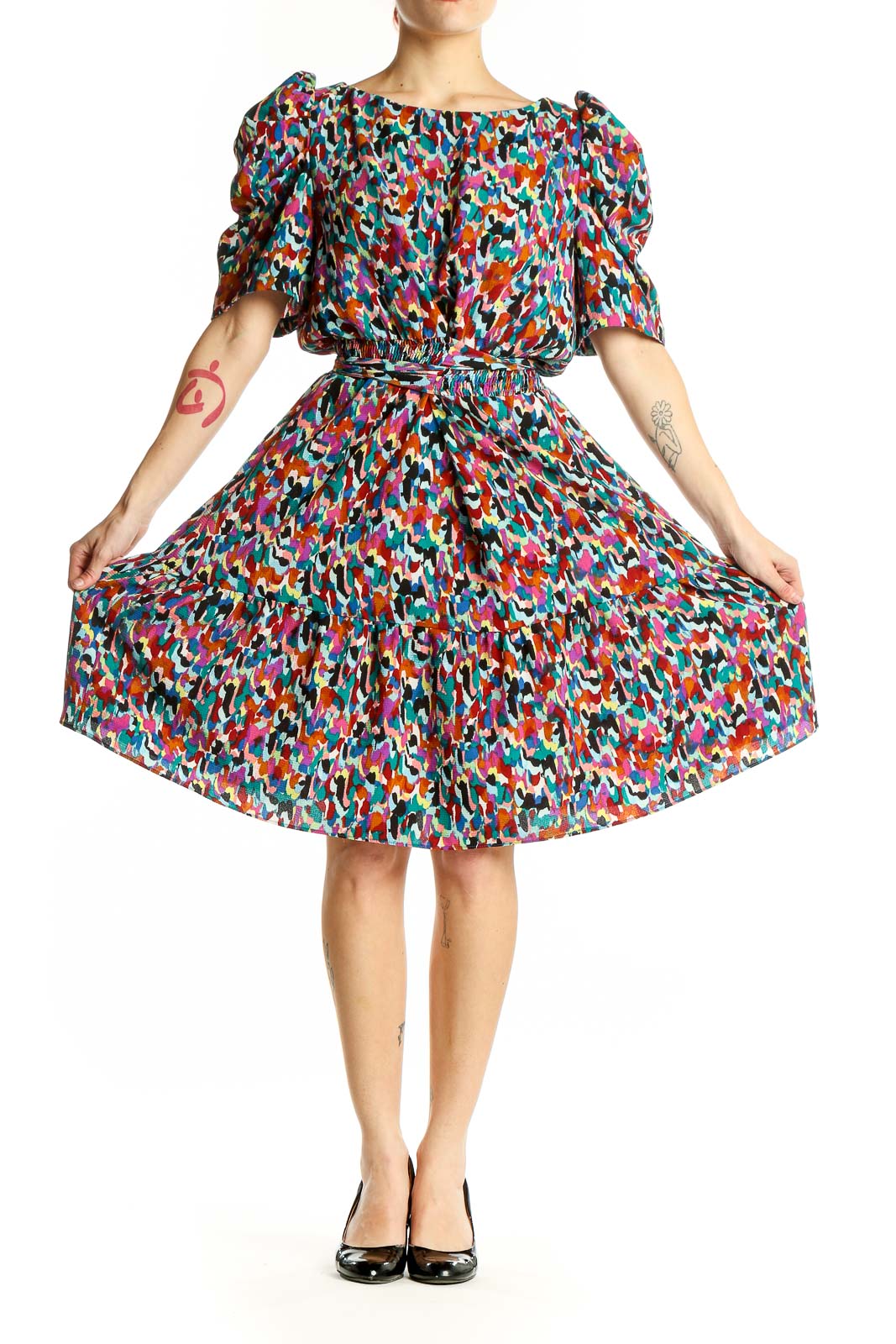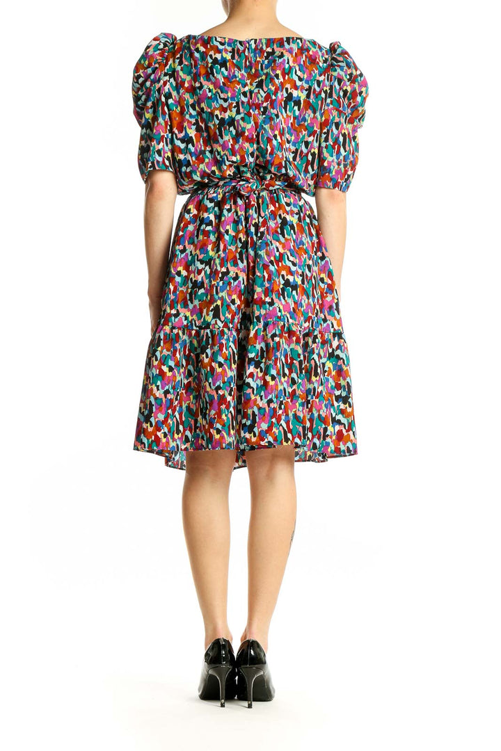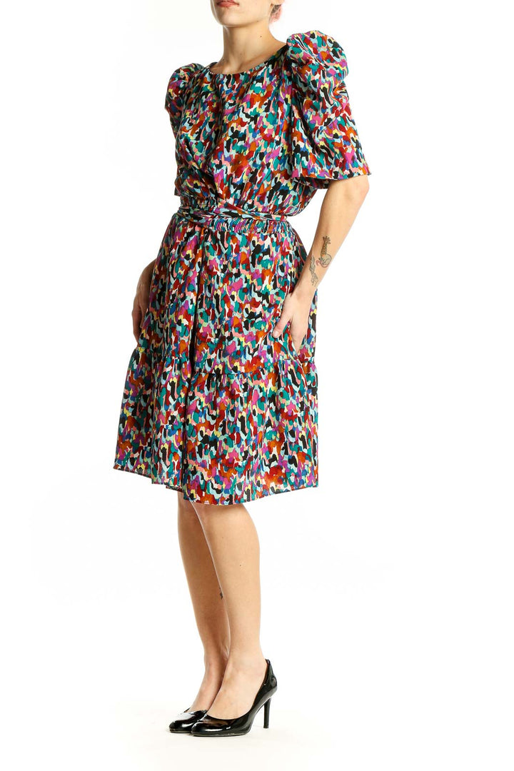 Make a vibrant statement with this eye-catching multicolor abstract print dress from London Times. The playful pattern features a kaleidoscope of colors including blue, pink, orange, and teal, creating a lively and energetic look perfect for any occasion. The dress boasts charming puff sleeves that add a touch of whimsy and femininity to the silhouette.