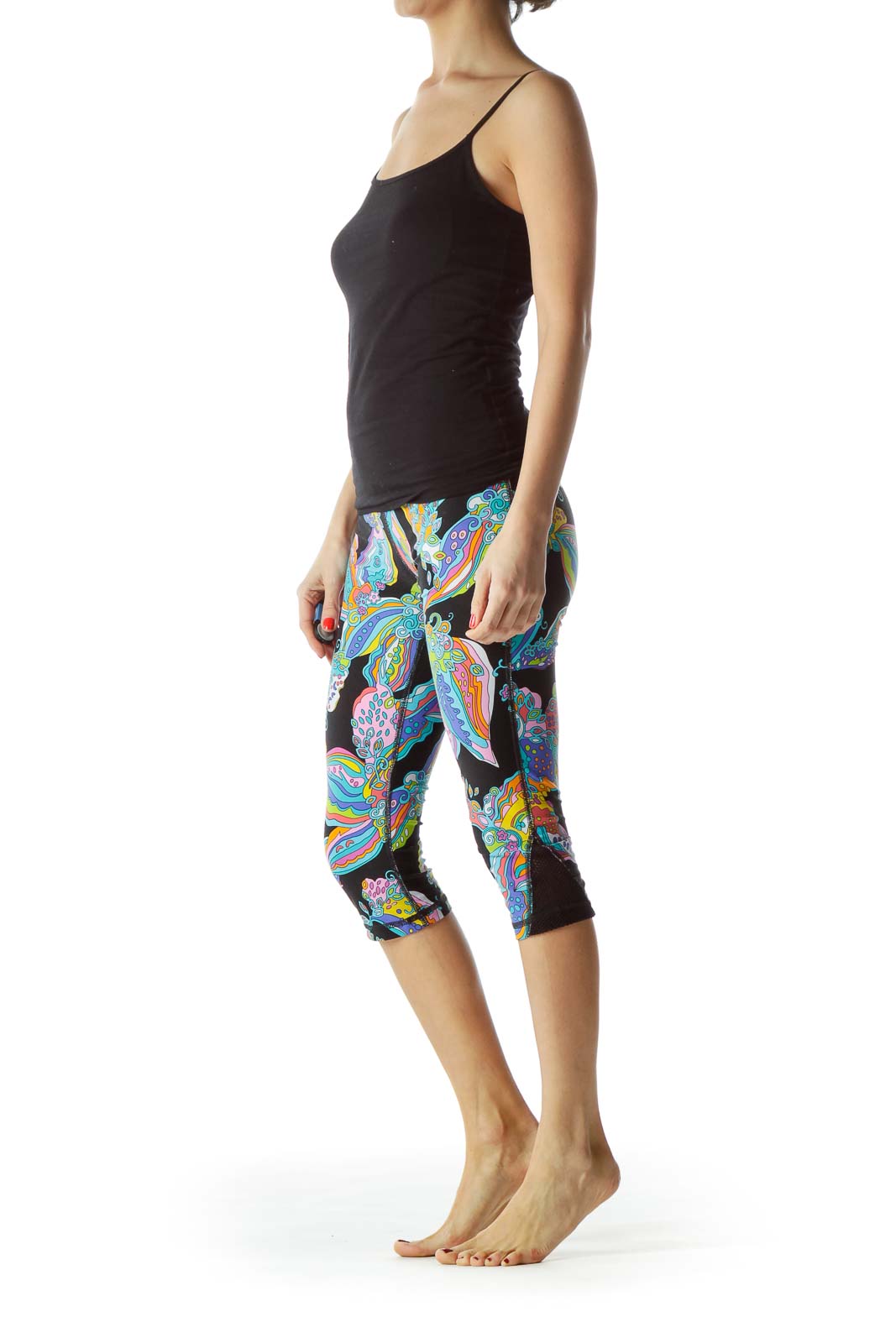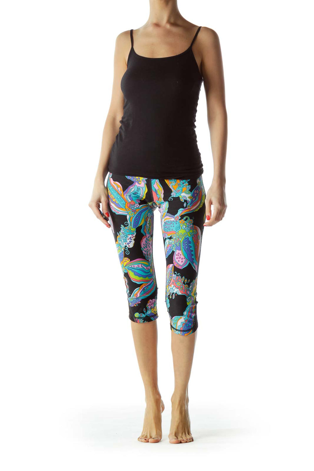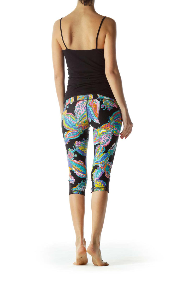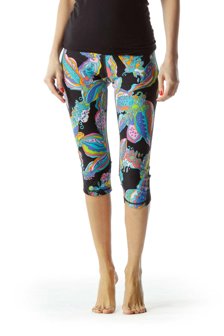 Make a bold statement with these vibrant Trina Turk capri leggings. Featuring an eye-catching multicolor floral print on a black background, these leggings are perfect for adding a pop of color to your activewear collection. The form-fitting design and cropped length offer both style and comfort for your workout or casual wear.