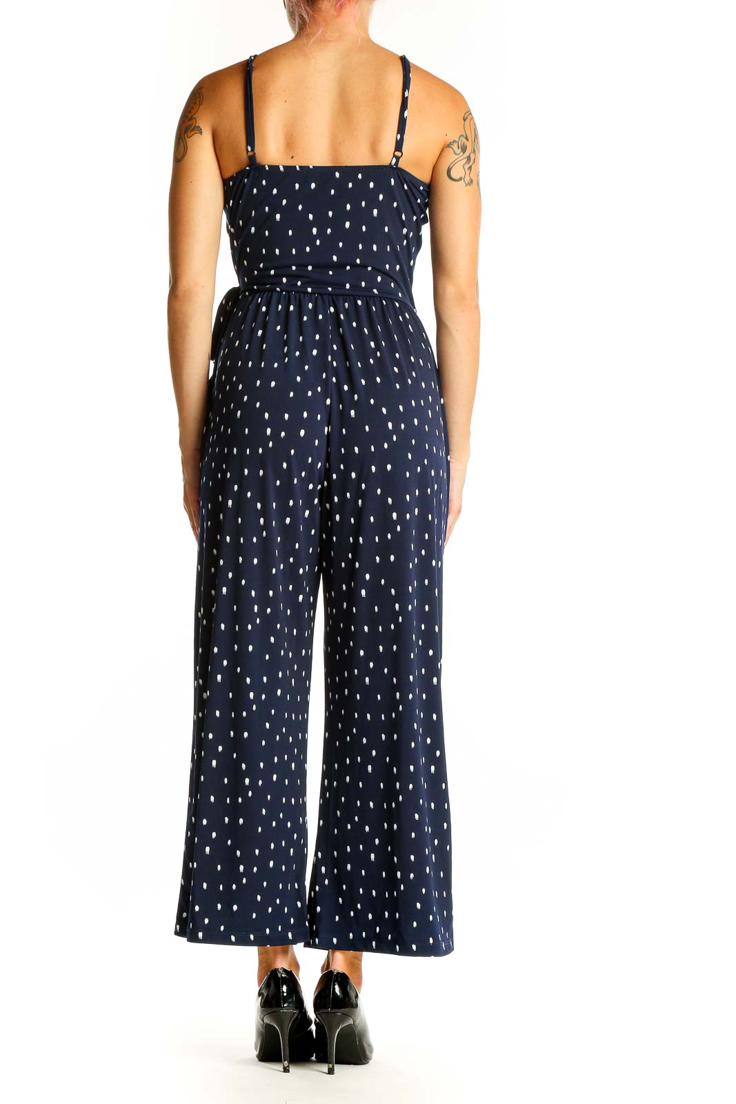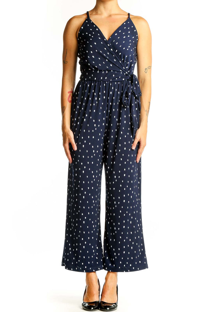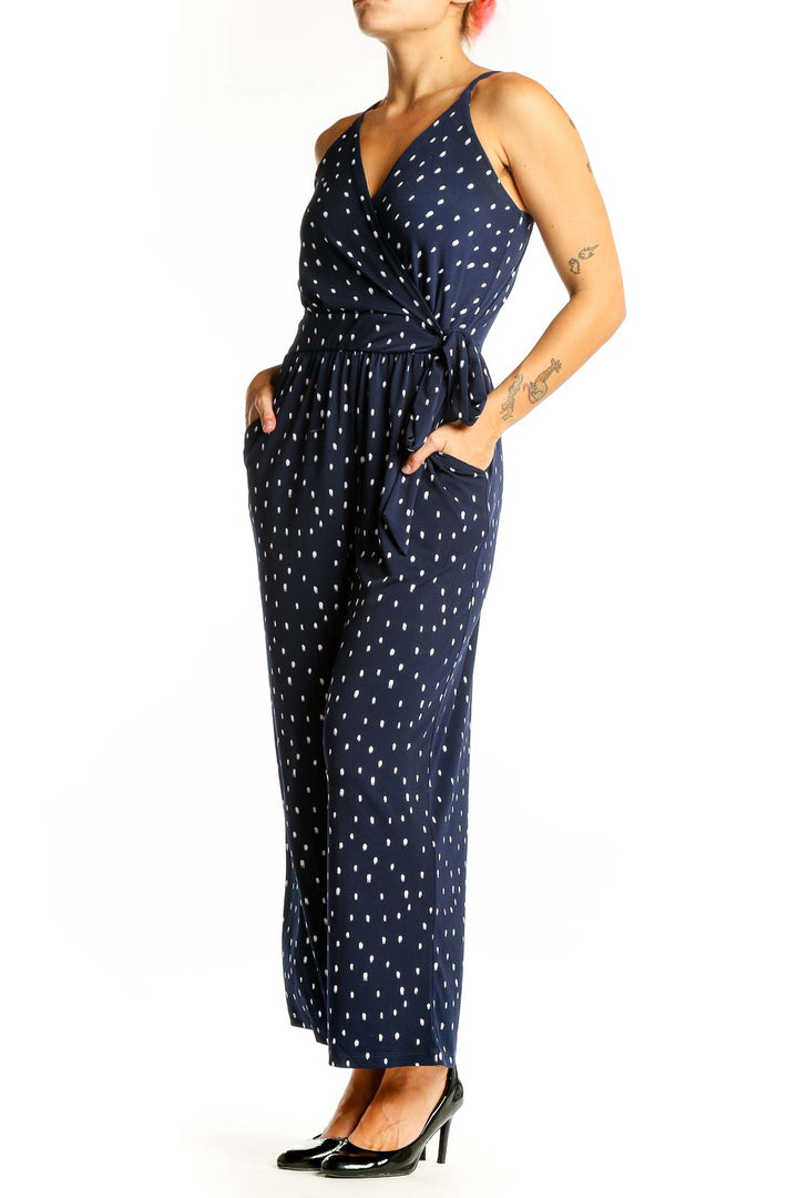 Step out in style with this charming navy polka dot jumpsuit from Kaileigh. The all-in-one design features a flattering wrap-style bodice with a plunging V-neckline, perfect for showcasing your favorite necklaces. Thin adjustable straps offer a comfortable fit, while the elasticated waist cinches in to create a feminine silhouette. The wide-leg pants provide a breezy, relaxed feel that's ideal for warm weather outings.