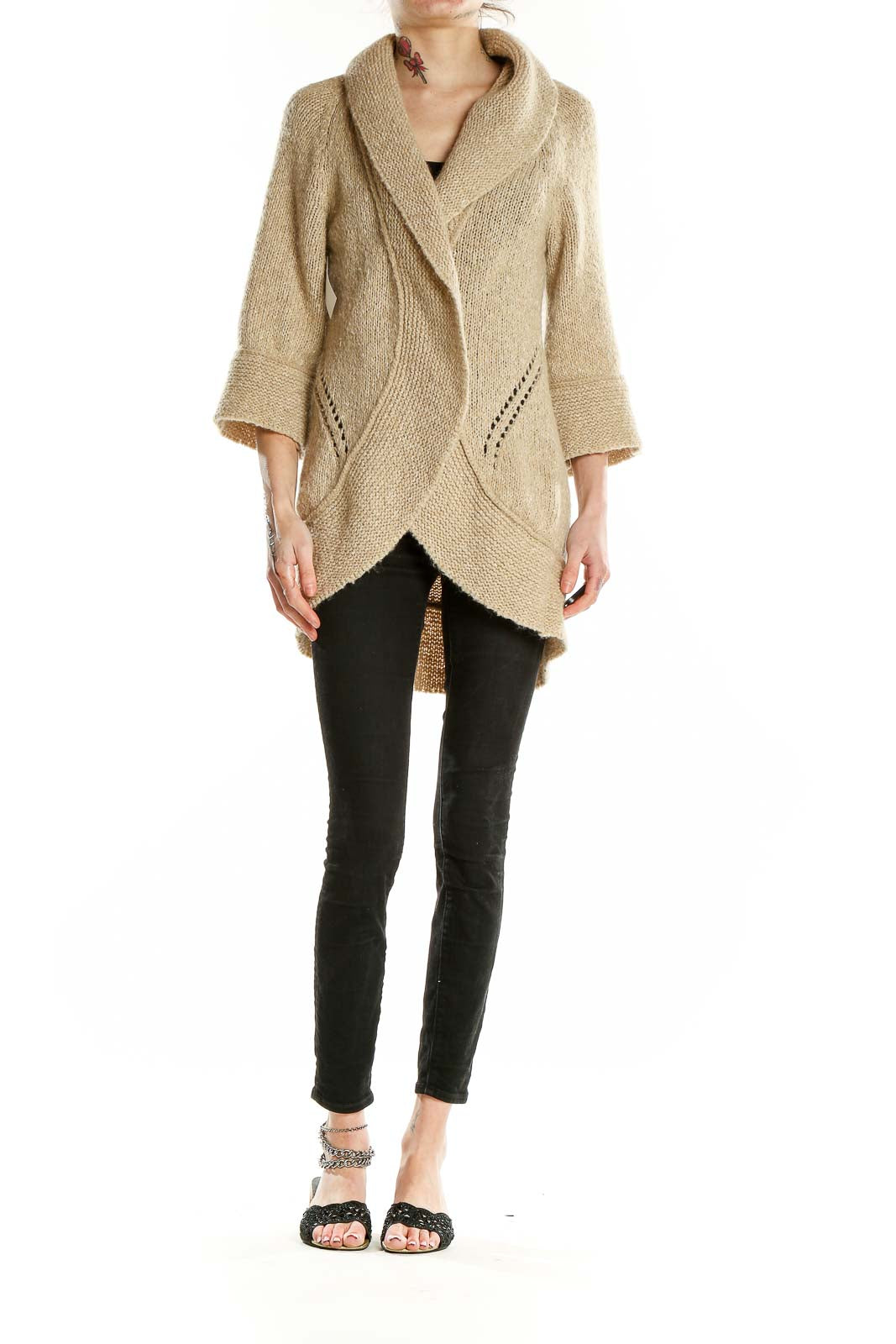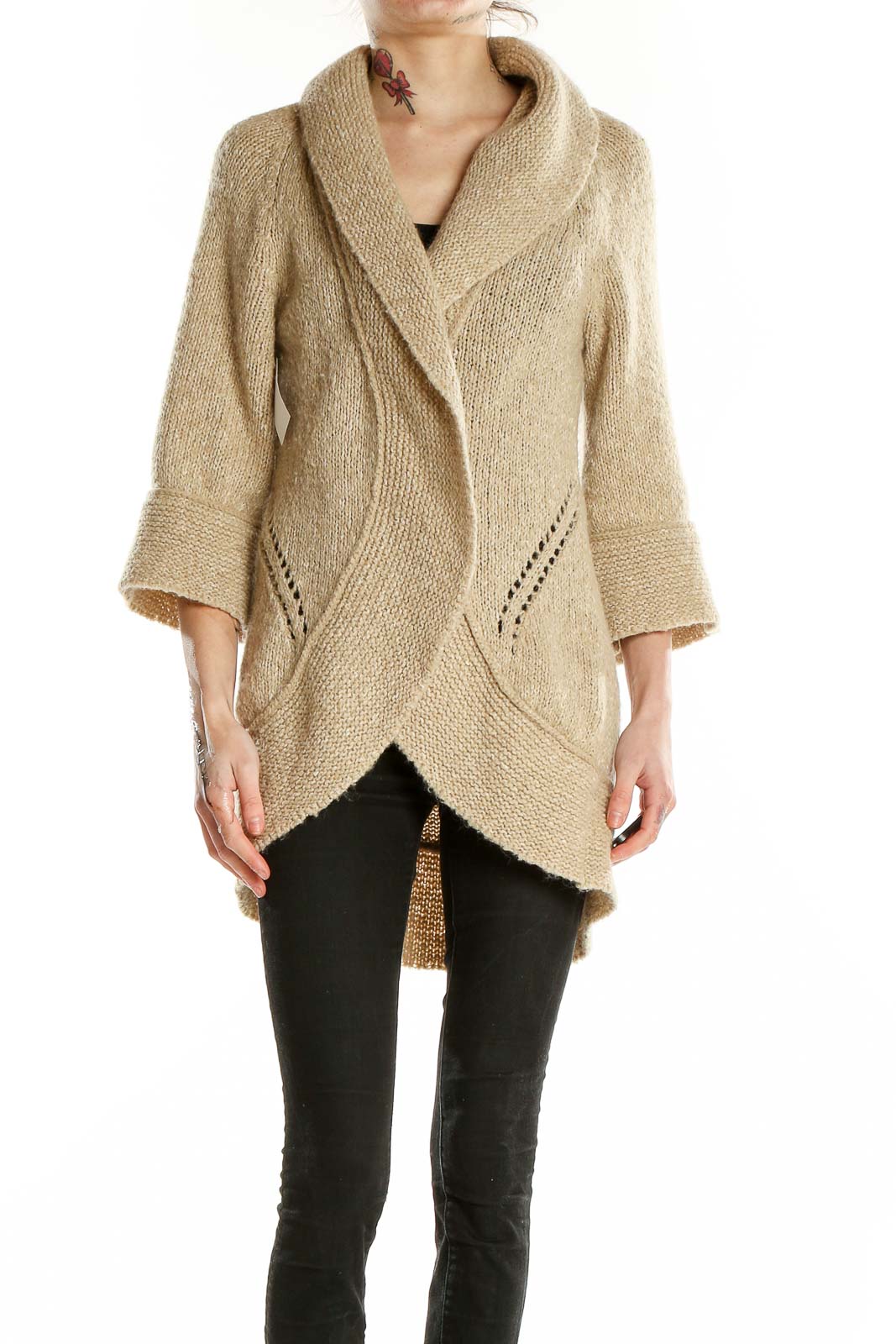 Featuring a unique curved hem design, this cardigan creates a flattering silhouette that drapes beautifully over any outfit. The 3/4 length sleeves with ribbed cuffs add a stylish detail and allow for easy layering. Delicate eyelet patterns along the sides and back provide subtle texture and visual interest.