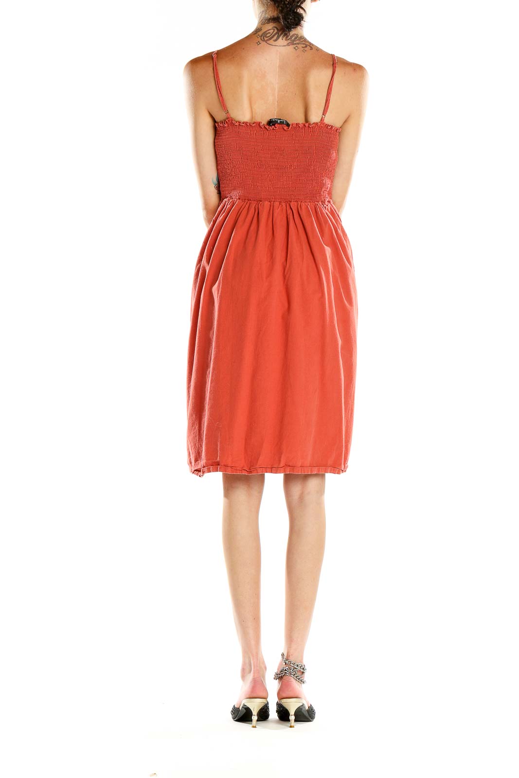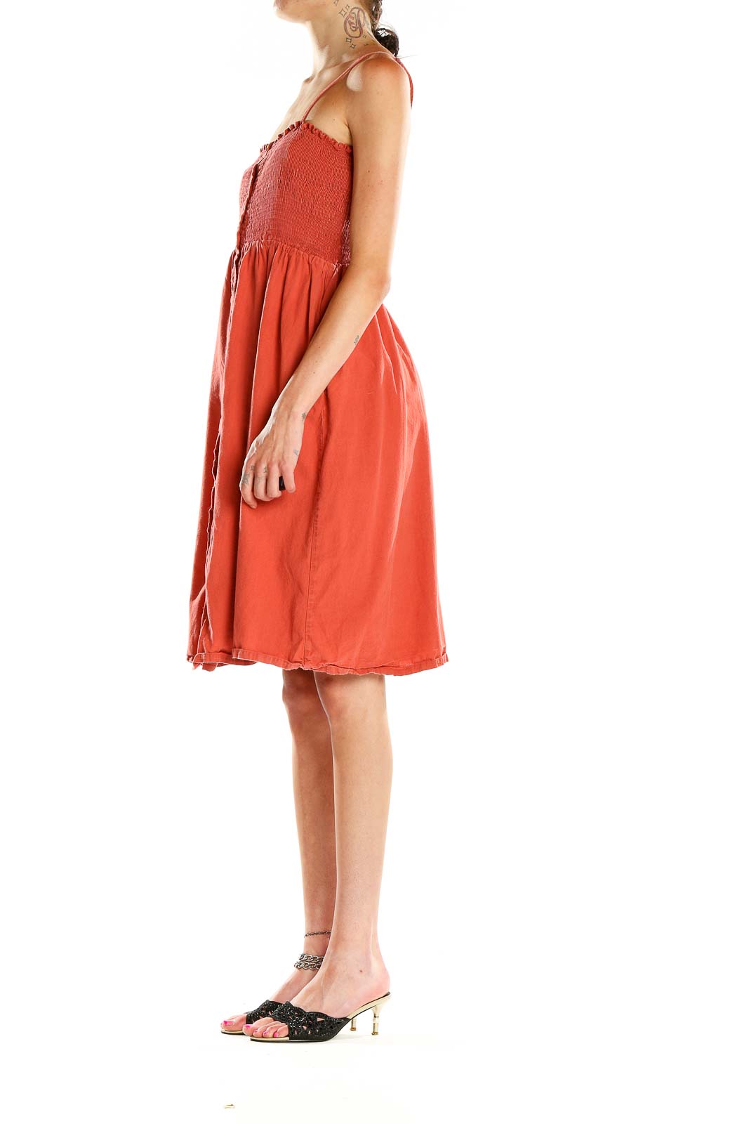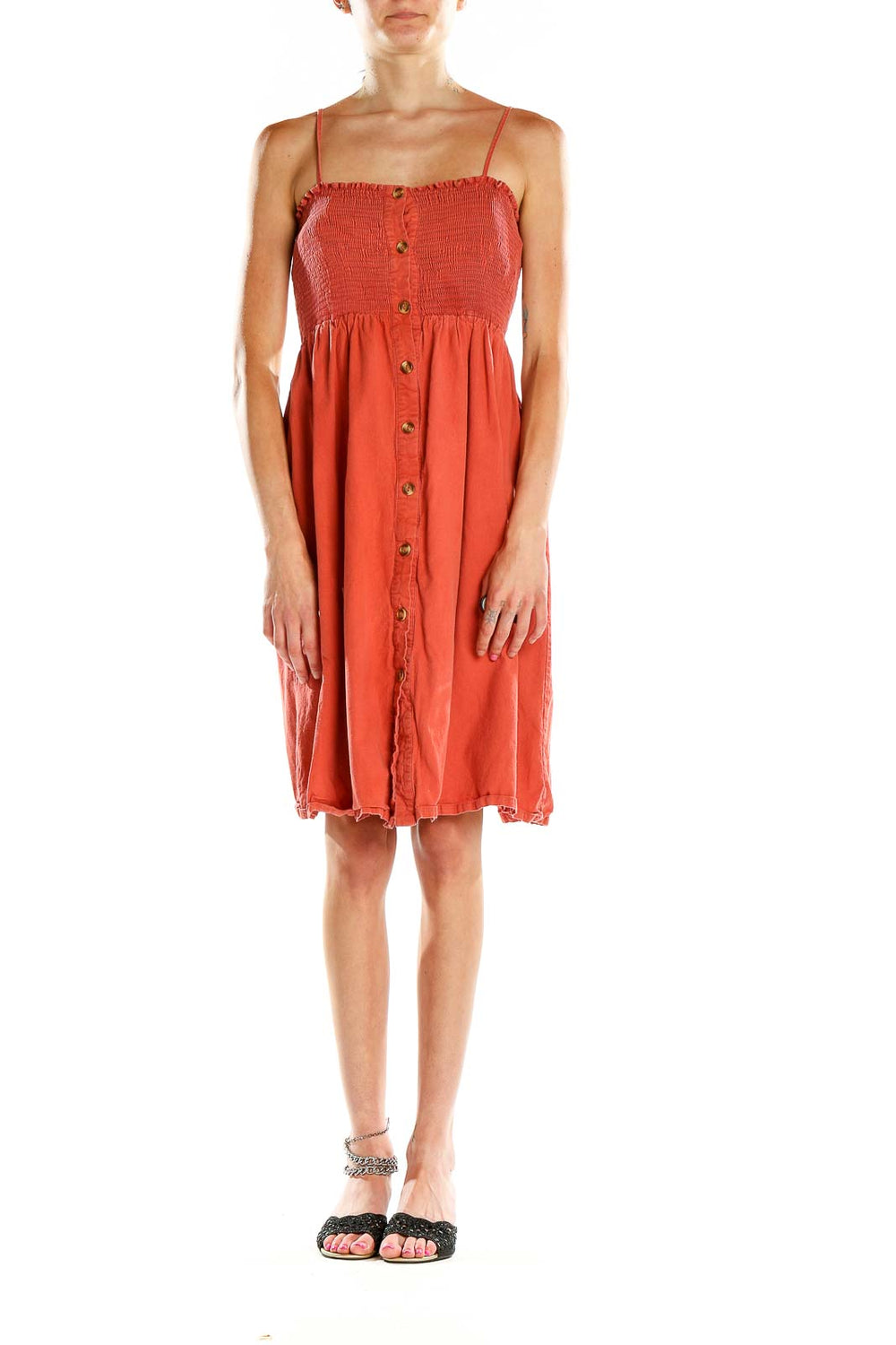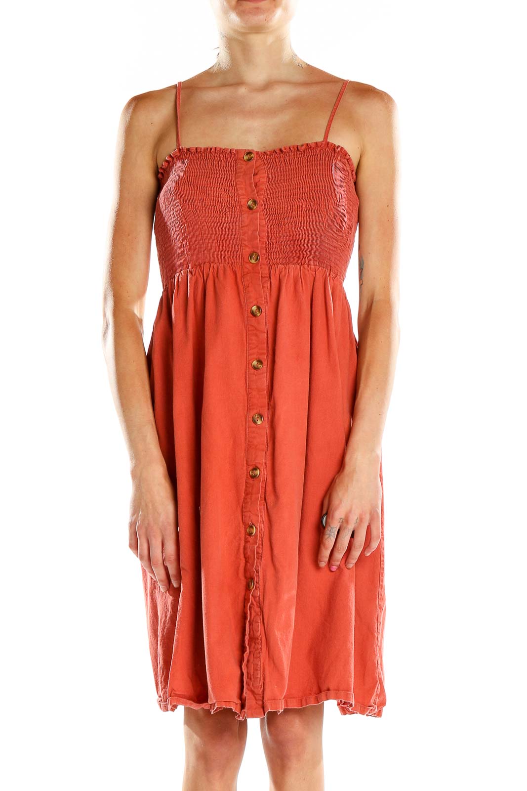 Front view of Lulu's coral sundress with smocked bodice and button-front detail