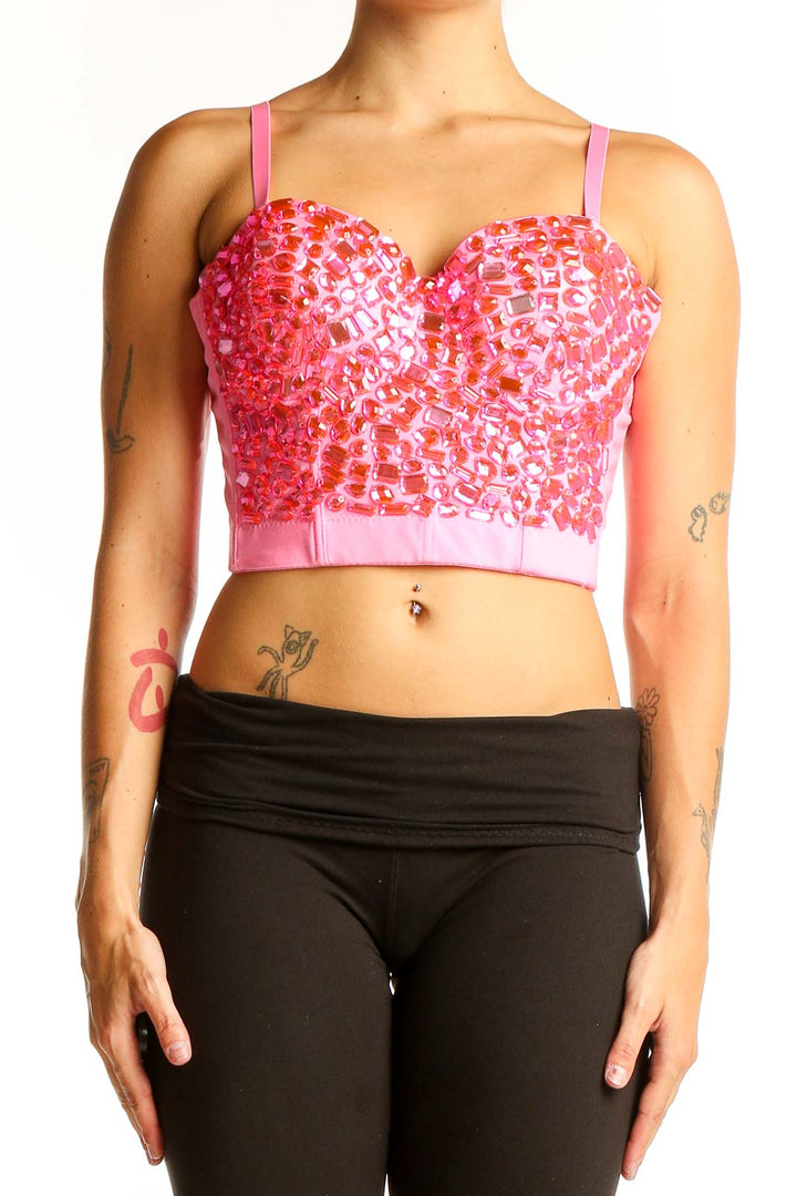 Make a dazzling statement with this eye-catching pink sequined crop top from Lydia USA. This stunning piece features a sweetheart neckline adorned with an intricate pattern of shimmering pink sequins that catch the light beautifully. The fitted silhouette and cropped length create a flattering shape, perfect for pairing with high-waisted bottoms. Crafted from polyester, this top offers both comfort and durability. The adjustable spaghetti straps ensure a perfect fit, while the bustier-style design adds a touch of glamour. Ideal for parties, nights out, or any occasion where you want to shine. This brand new top with tags is a must-have addition to any fashion-forward wardrobe.