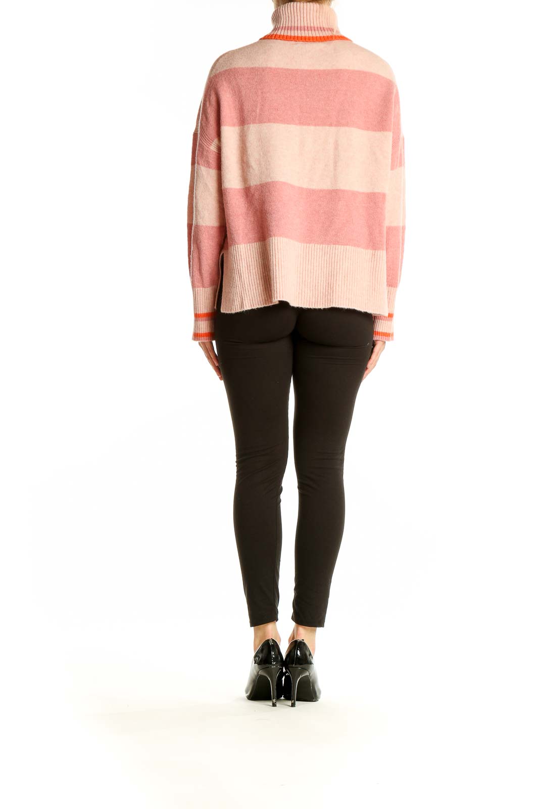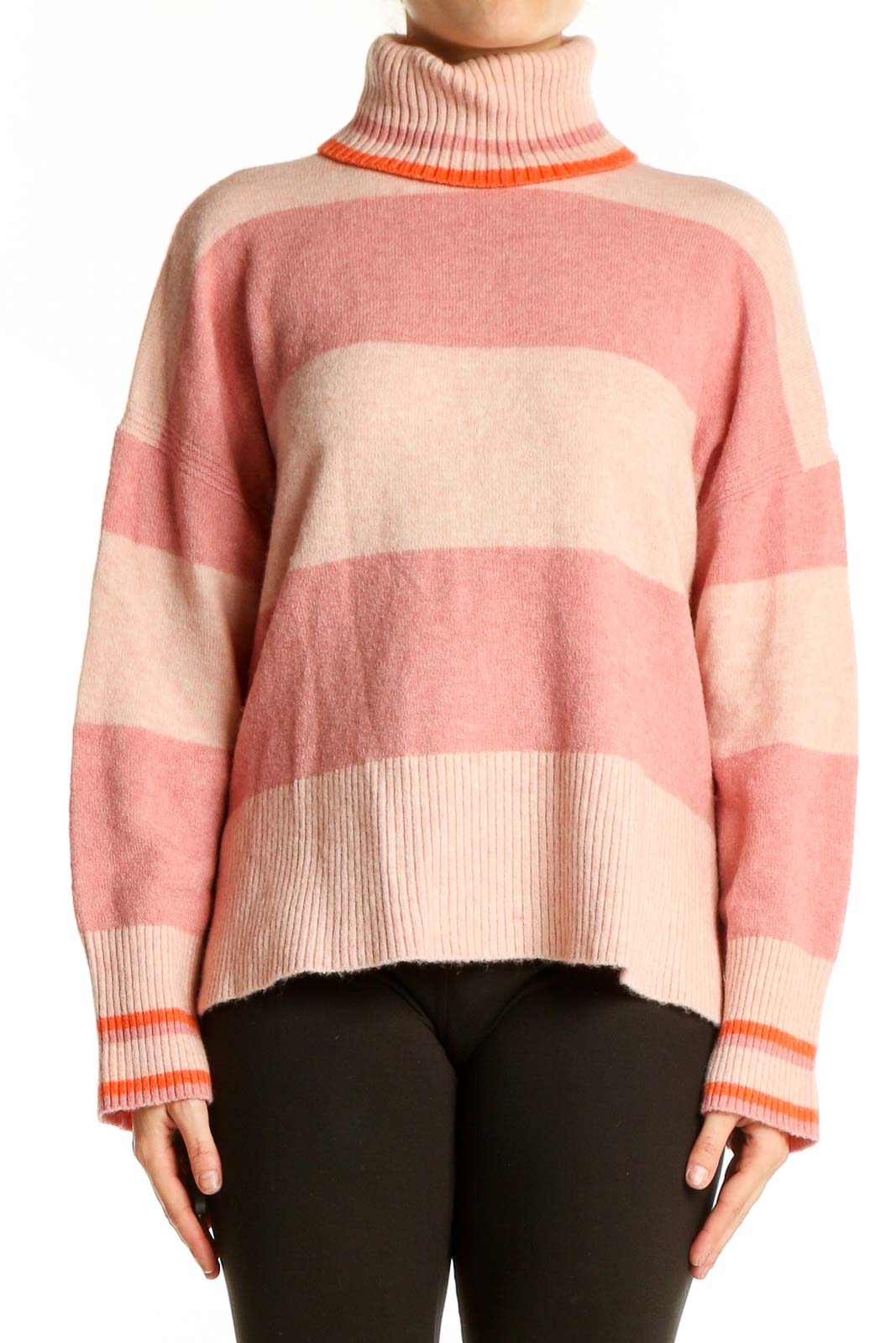 Embrace cozy elegance with this stunning pink striped turtleneck sweater from J.Crew. Crafted from a luxurious blend of alpaca, merino wool, and polyamide, this sweater offers both warmth and style for the cooler seasons. The eye-catching horizontal stripes in various shades of pink create a playful yet sophisticated look, while the vibrant orange accents on the collar and cuffs add a pop of unexpected color.