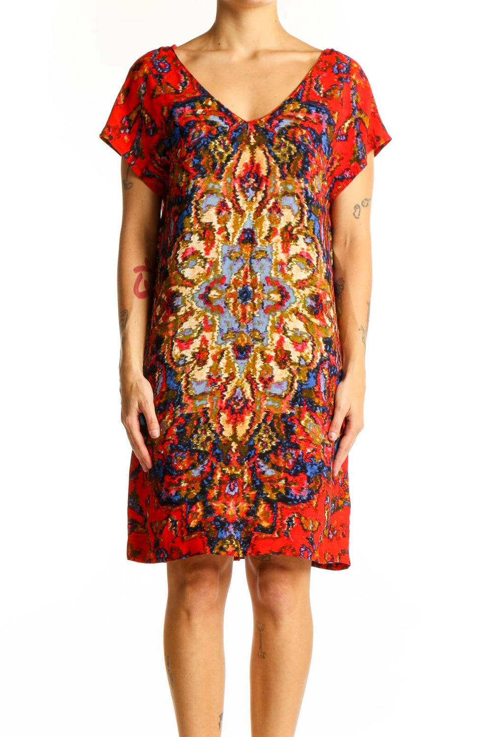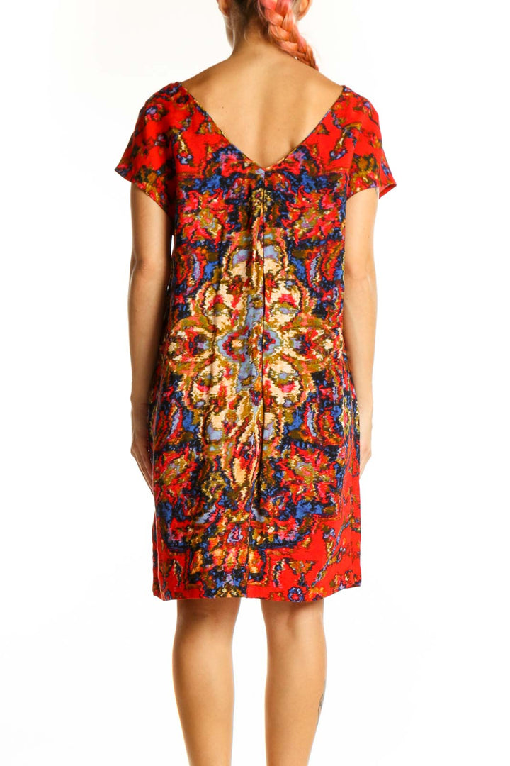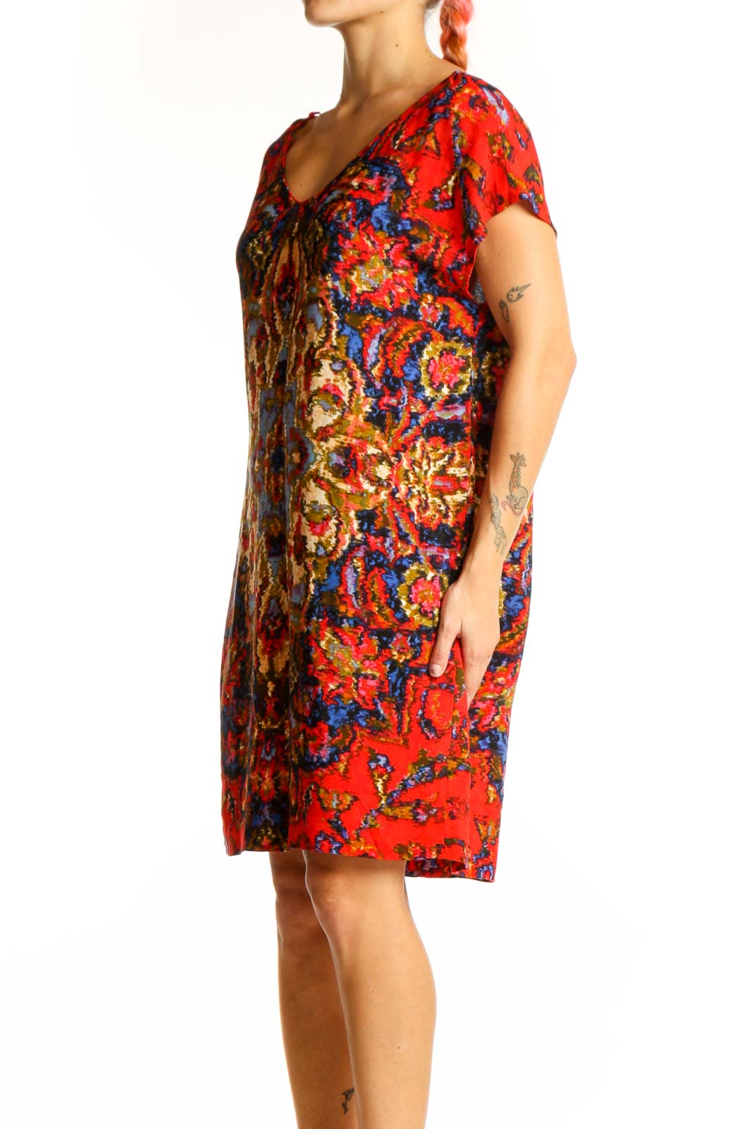 Make a vibrant statement with this eye-catching red floral shift dress from Maeve. The dress features a stunning kaleidoscope of colors, with a bold red base adorned with an intricate floral pattern in shades of blue, yellow, and orange. The loose-fitting shift silhouette offers comfort and ease of movement, perfect for various occasions.