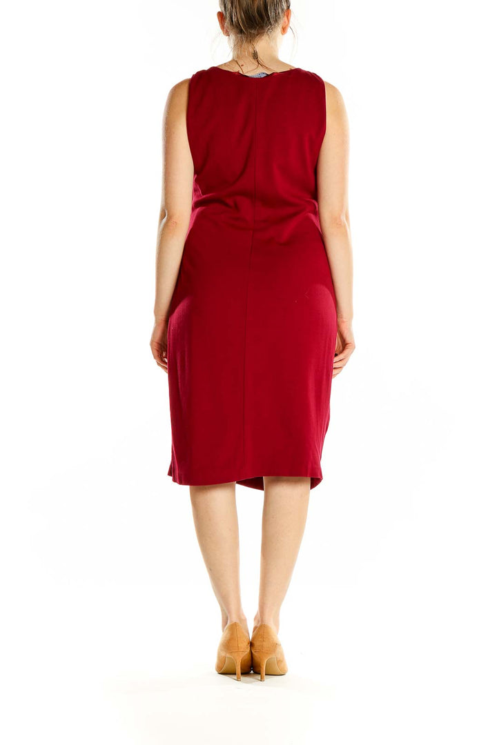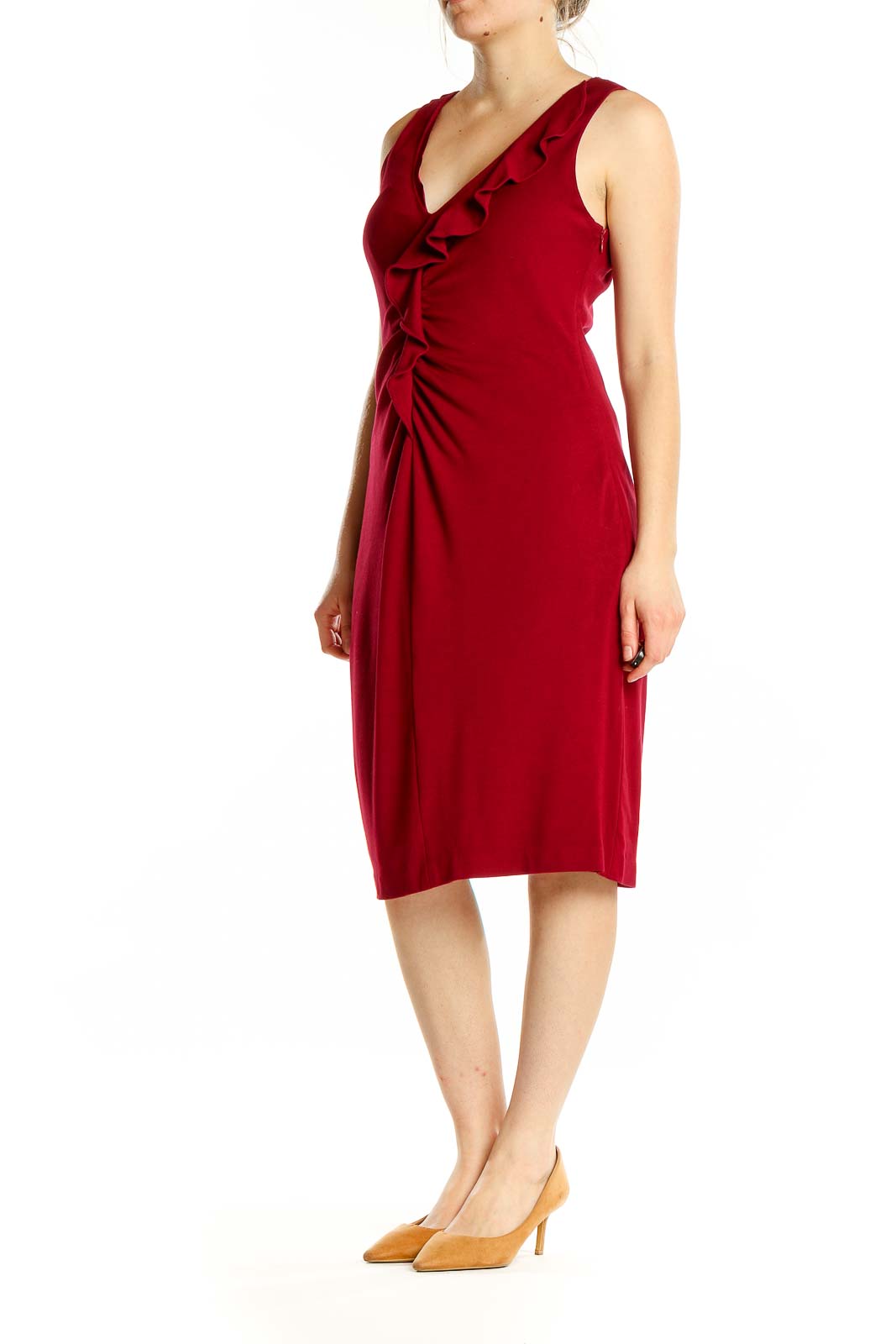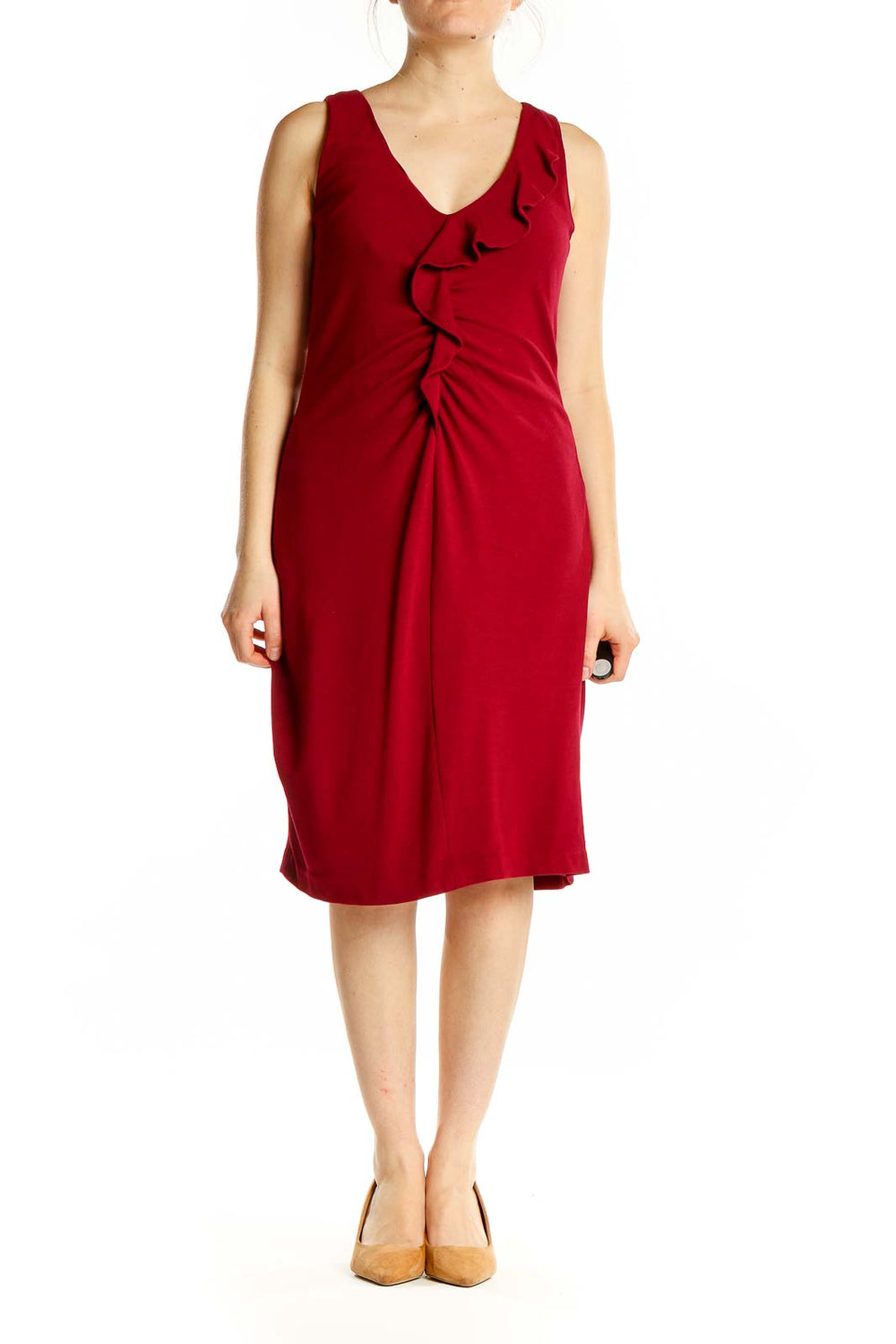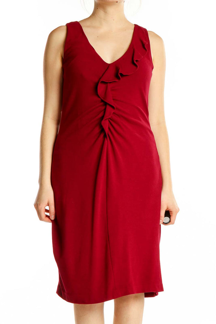 Make a striking impression in this elegant red midi dress from Elie Tahari. Crafted from a luxurious blend of polyester, rayon, spandex, and viscose, this sleeveless dress offers both comfort and style. The V-neckline is adorned with a graceful ruffle detail, adding a touch of femininity to the silhouette. The ruched gathering at the waist creates a flattering drape that accentuates your curves. With its versatile knee-length cut and rich crimson hue, this dress is perfect for both office wear and evening events. The excellent condition ensures you'll look polished and put-together for any occasion.