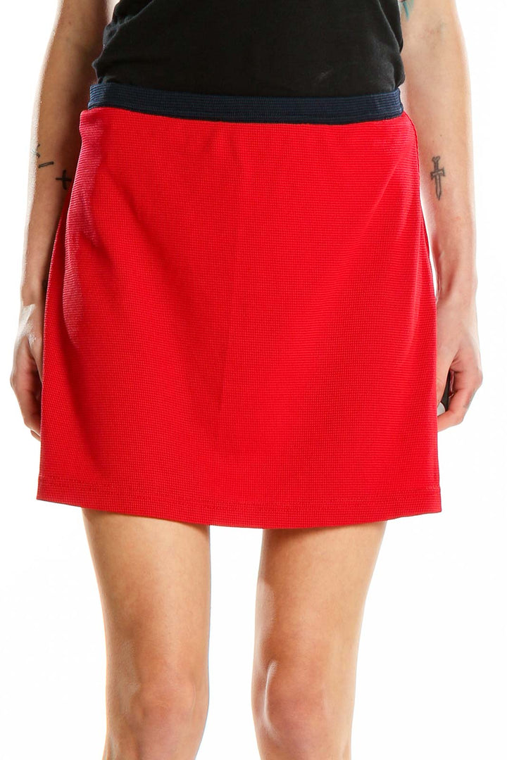 The standout red color is complemented by a navy blue elastic waistband, adding a touch of contrast and sophistication. With a 32-inch waist and 38-inch hip measurement, this large-sized skort ensures a comfortable fit for various body types. The built-in shorts provide coverage and prevent ride-up during movement, while the outer skirt layer adds a feminine touch.
