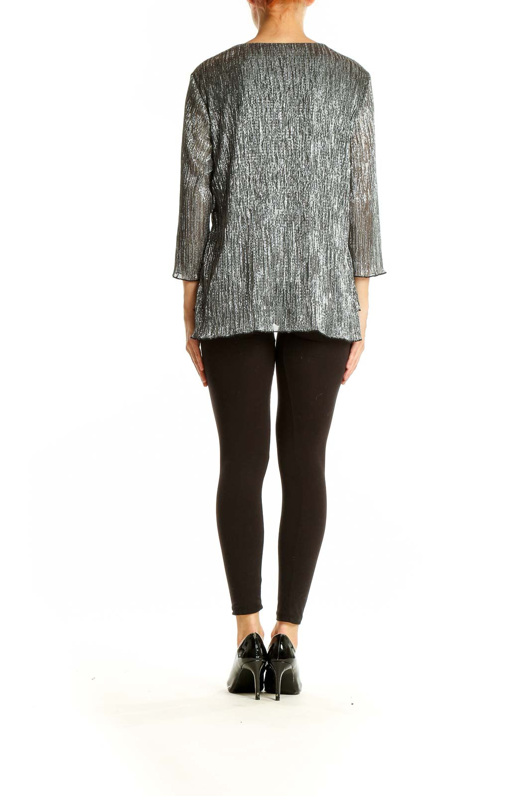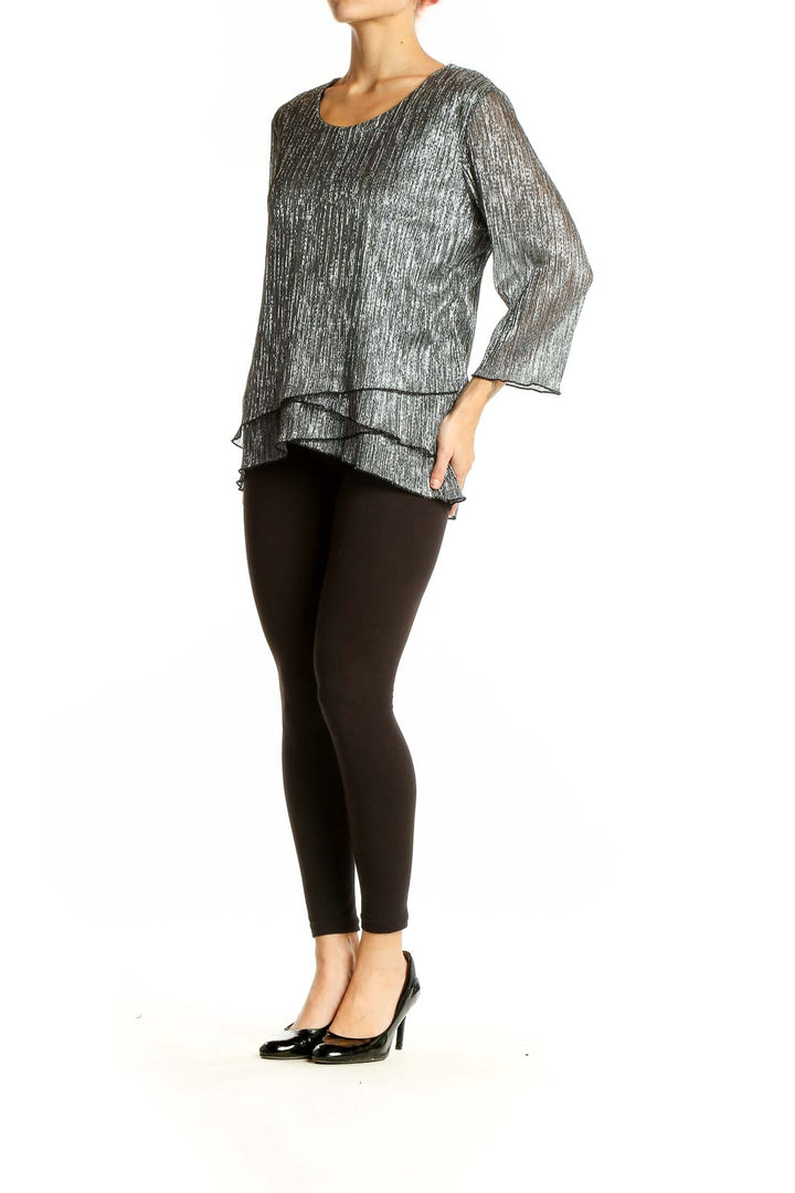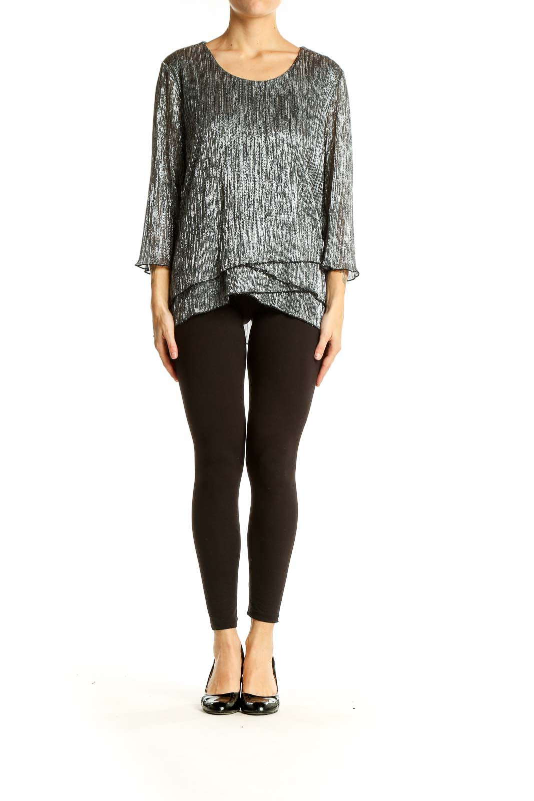 Crafted from a blend of metallic and polyester materials, this blouse offers both comfort and durability. The scoop neckline and 3/4 length sleeves provide a versatile and elegant look suitable for various occasions. The tiered hem adds a touch of whimsy and creates a flattering drape.