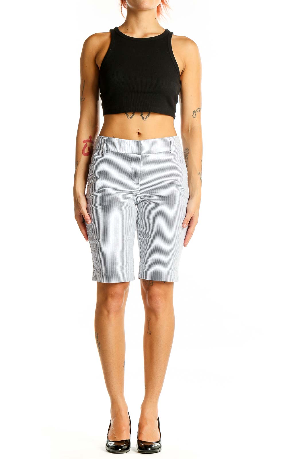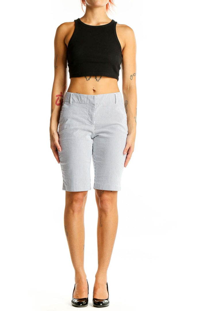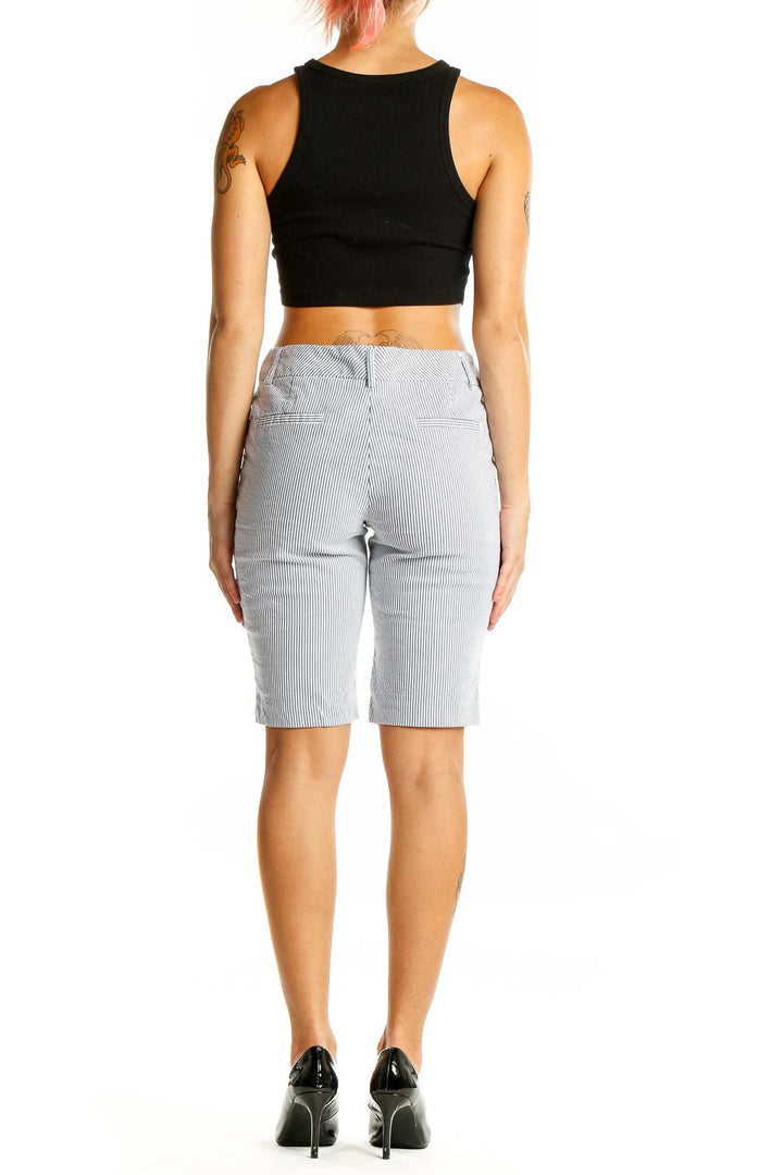 Step into summer with these chic gray and white striped Bermuda shorts from Halogen. Crafted from a comfortable blend of cotton, nylon, and spandex, these shorts offer both style and flexibility. The classic pinstripe pattern adds a touch of sophistication, making them perfect for casual outings or semi-formal events.