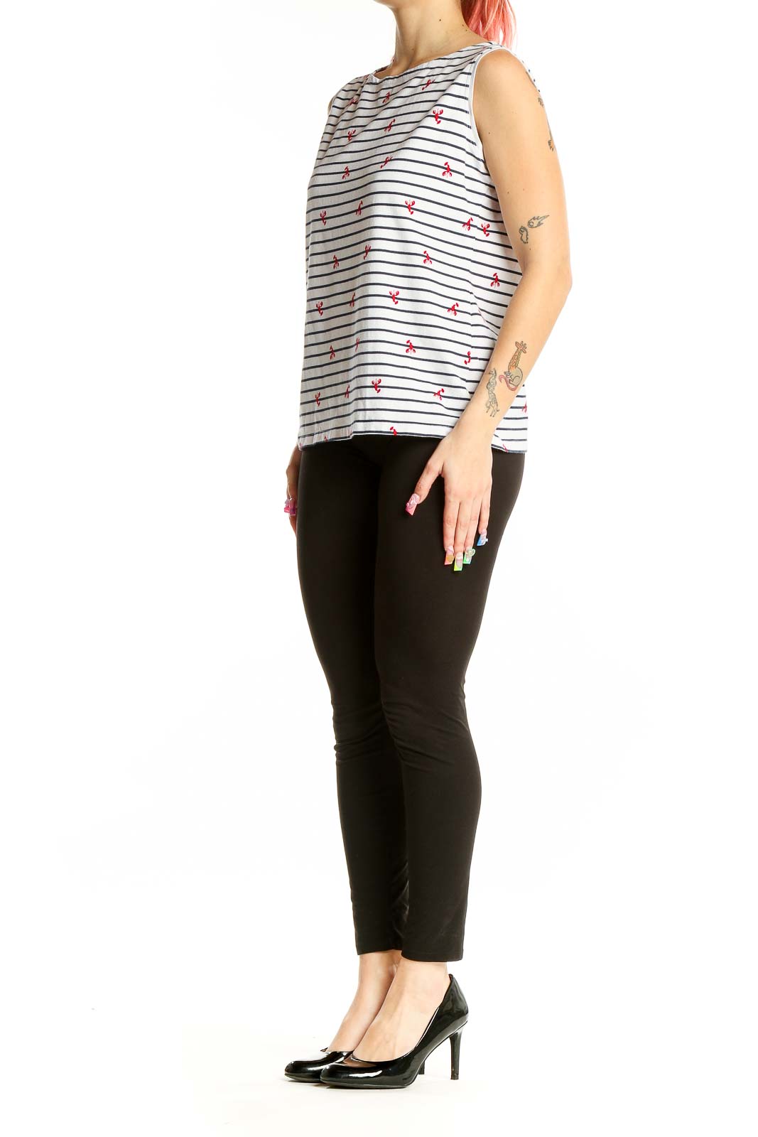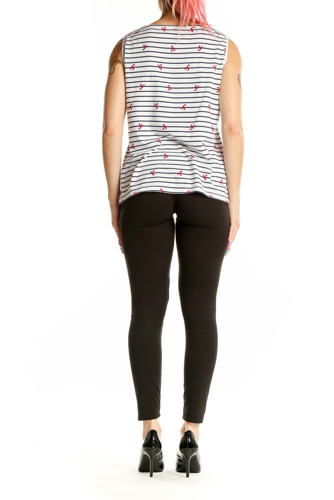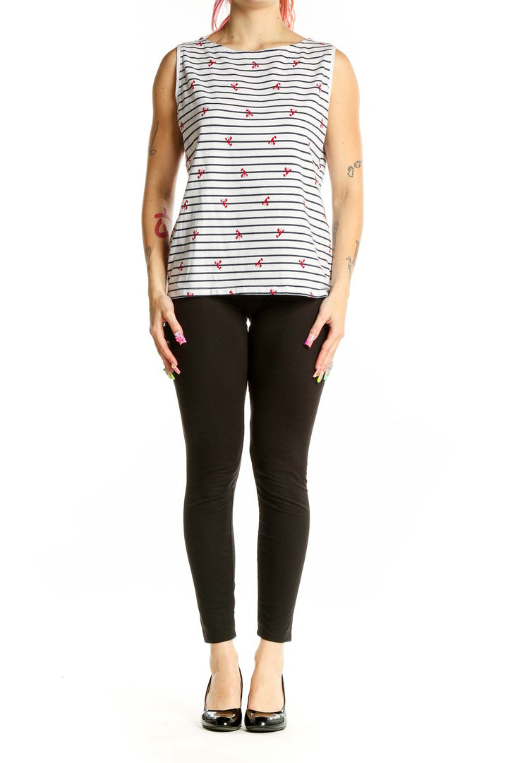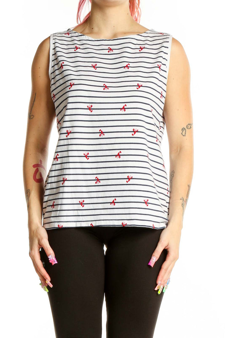 Elevate your casual wardrobe with this charming sleeveless top from Talbots. Featuring a playful white and navy striped pattern adorned with delightful red cherry prints, this top effortlessly combines classic style with a fun, summery twist. The sleeveless design and boat neckline offer a flattering silhouette, perfect for warm days or layering under a cardigan.