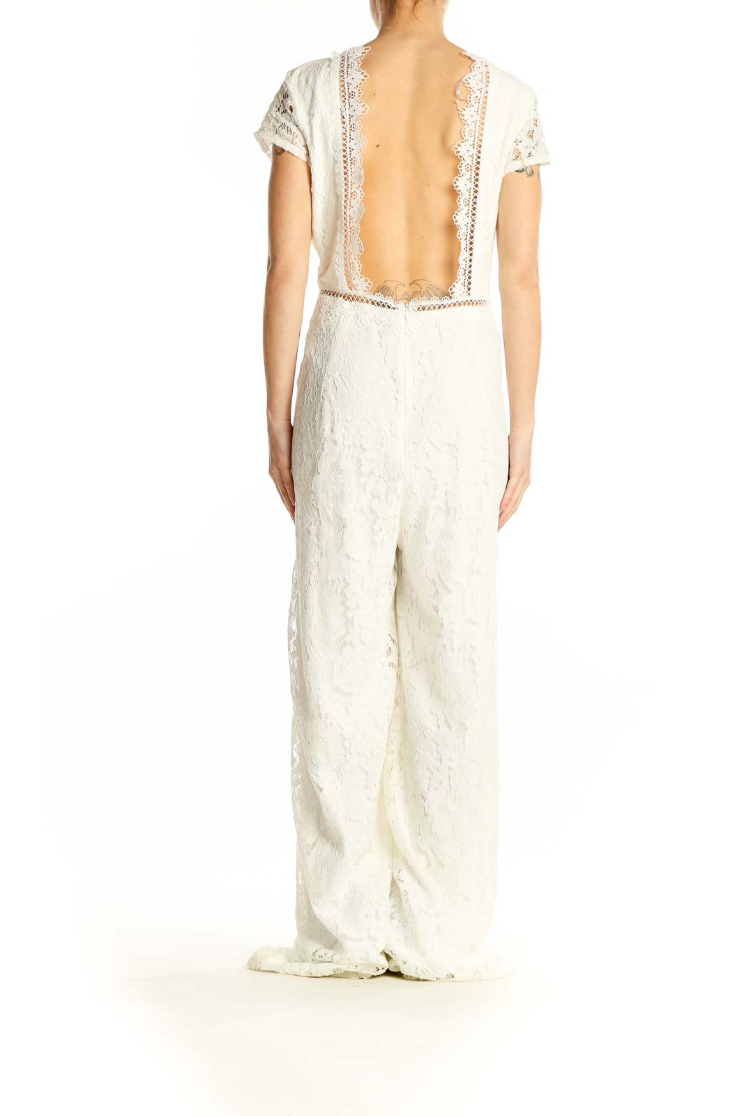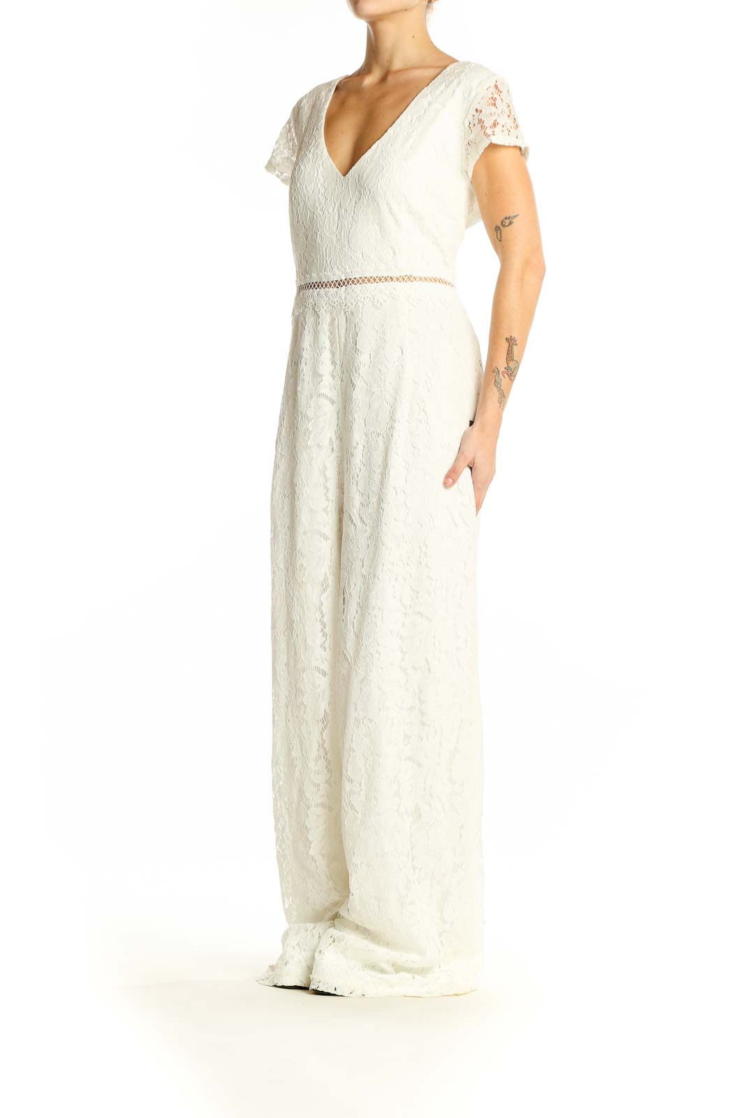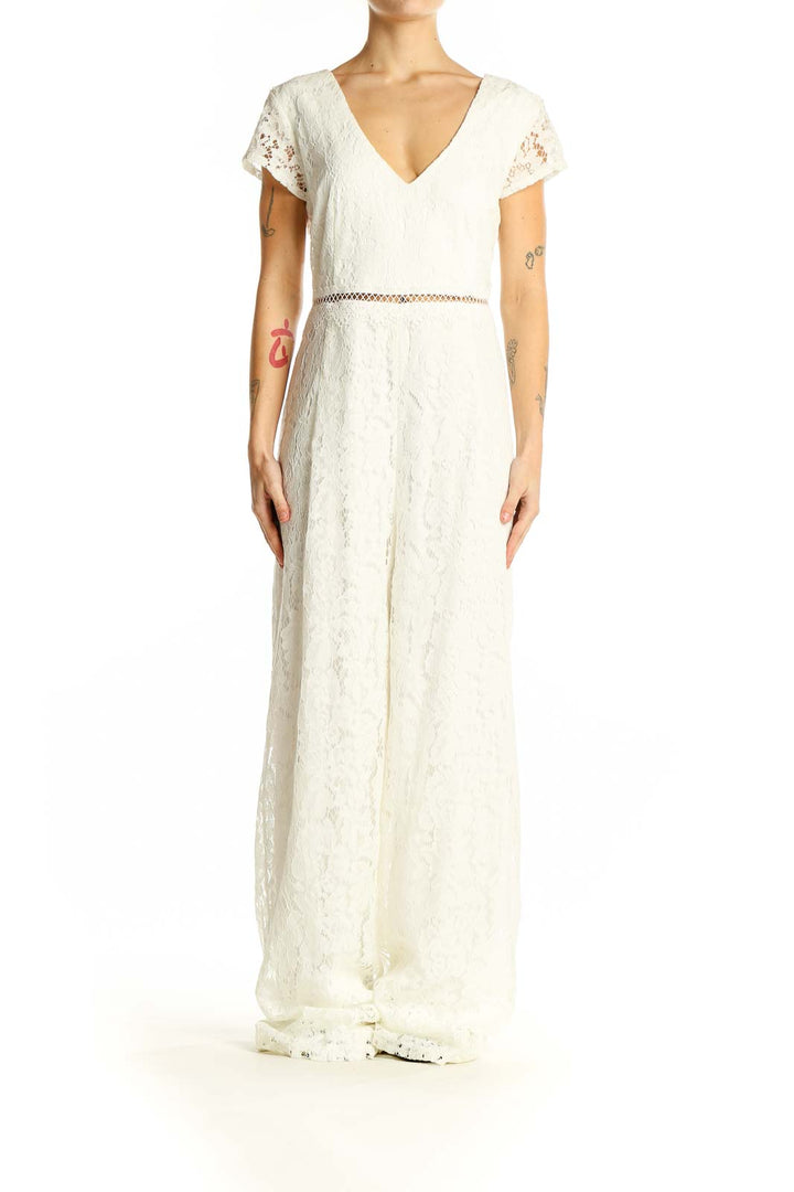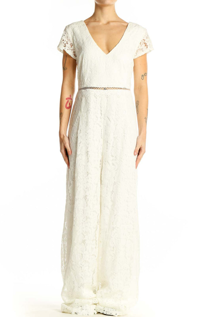Make a stunning entrance in this elegant white lace jumpsuit from Lulu's. Featuring a flattering V-neckline and short lace sleeves, this all-in-one piece exudes sophistication and grace. The wide-leg silhouette offers comfort and a fashionable flair, while the delicate lace overlay adds a touch of romance to your look. A subtle cutout detail at the waist creates a slimming effect, accentuating your figure beautifully. Crafted from a soft blend of cotton and nylon, this jumpsuit ensures both comfort and durability. Perfect for special occasions or a night out, this jumpsuit is a versatile addition to your wardrobe. New with tags, it's ready to make you feel confident and stylish.