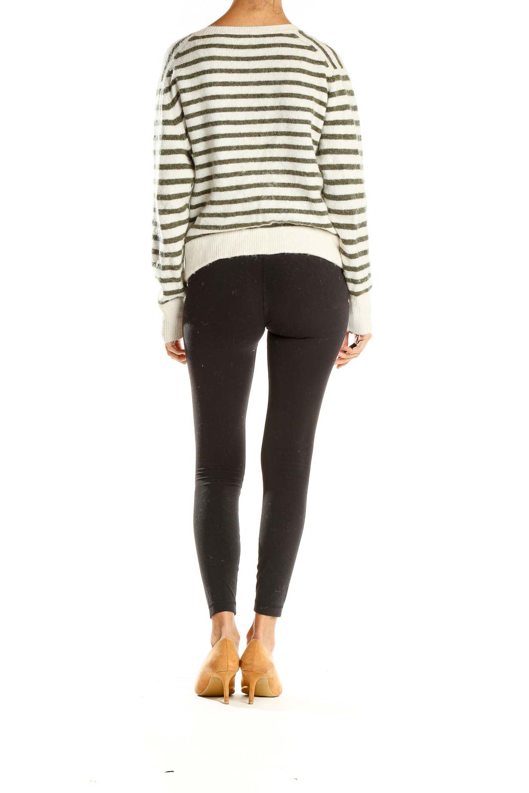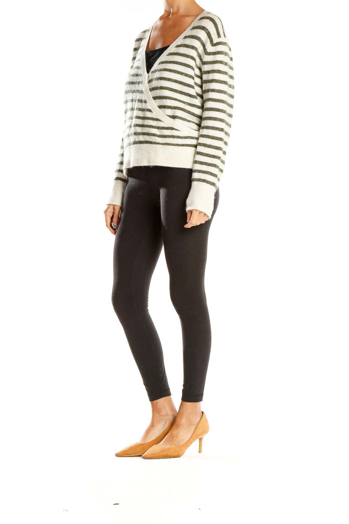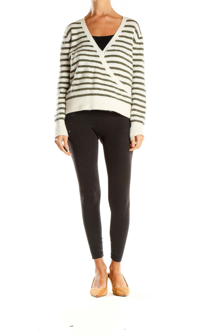 Elevate your casual wardrobe with this chic white and gray striped V-neck sweater from Madewell. This cozy knit features a flattering wrap-style front, creating a stylish and feminine silhouette. The medium-weight fabric offers warmth without bulk, making it perfect for layering or wearing on its own.